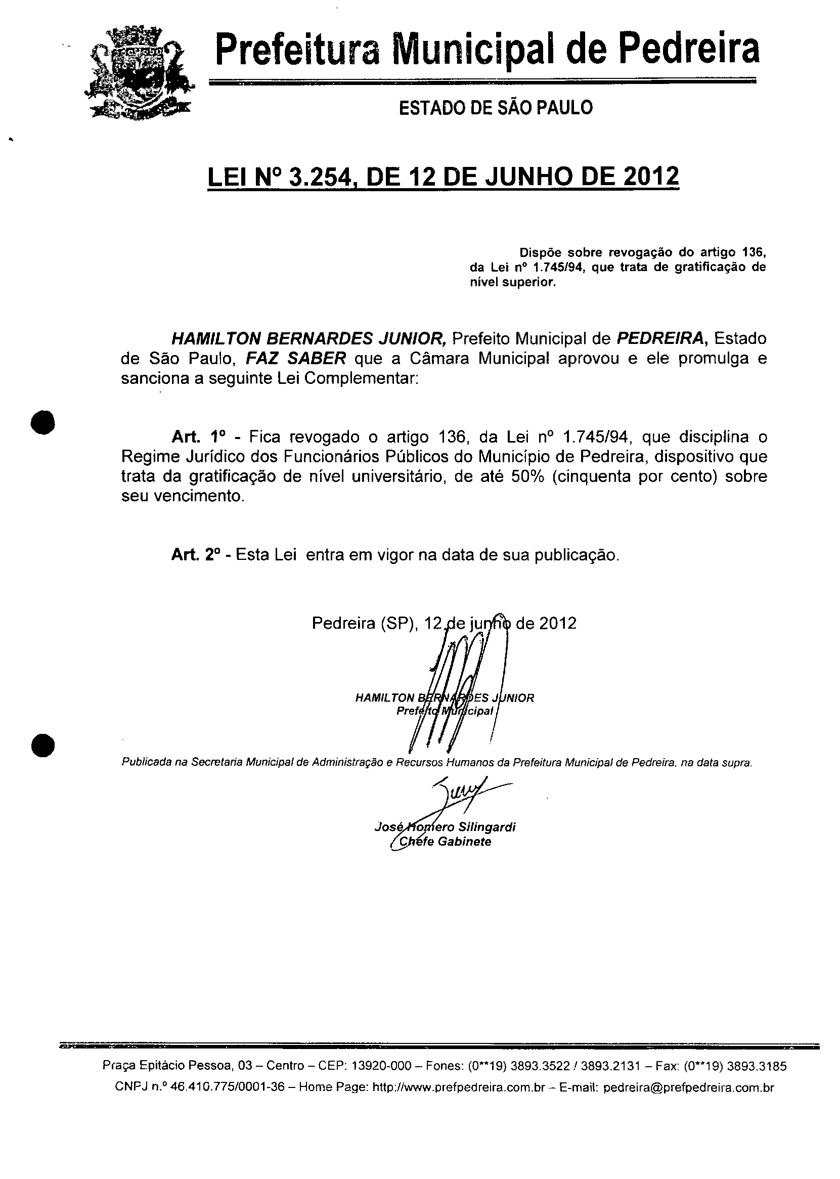 Ementa: Dispõe sobre revogação do artigo 136, da Lei nº 1.745/94, que trata de gratificação de nível superior.
