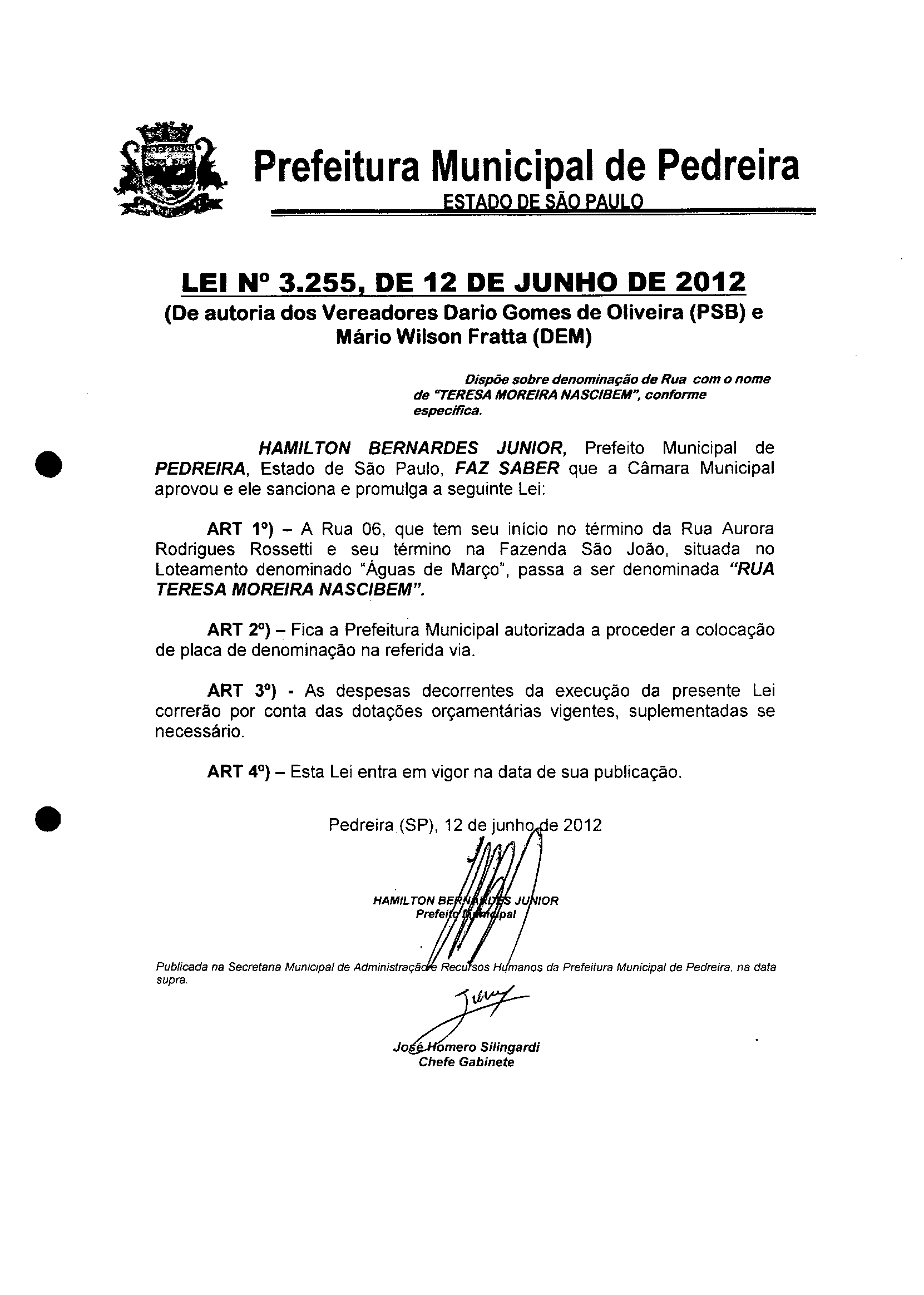 Ementa: Dispõe sobre denominação de Rua com o nome de "TERESA MOREIRA NASCIBEM", conforme especifica.