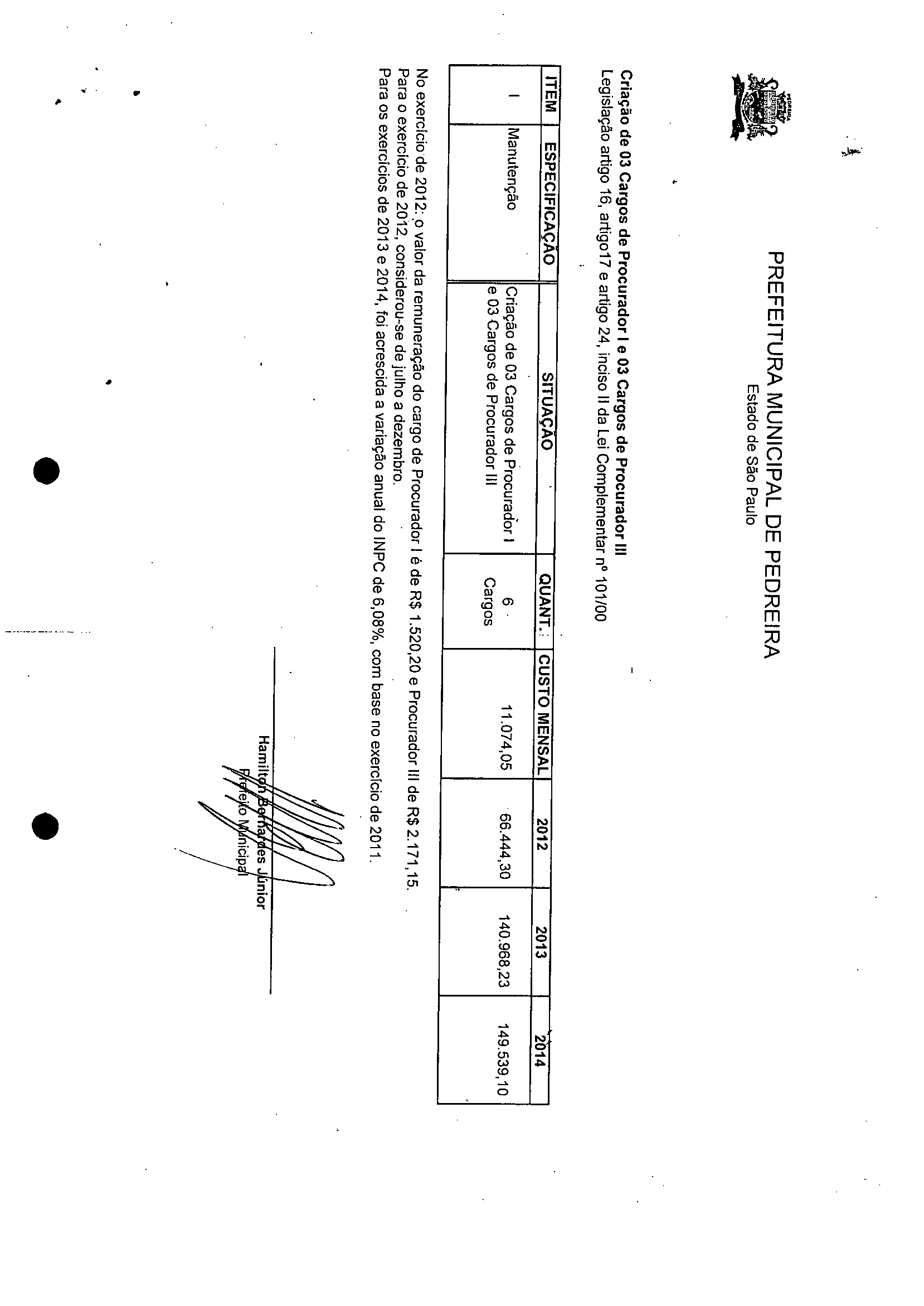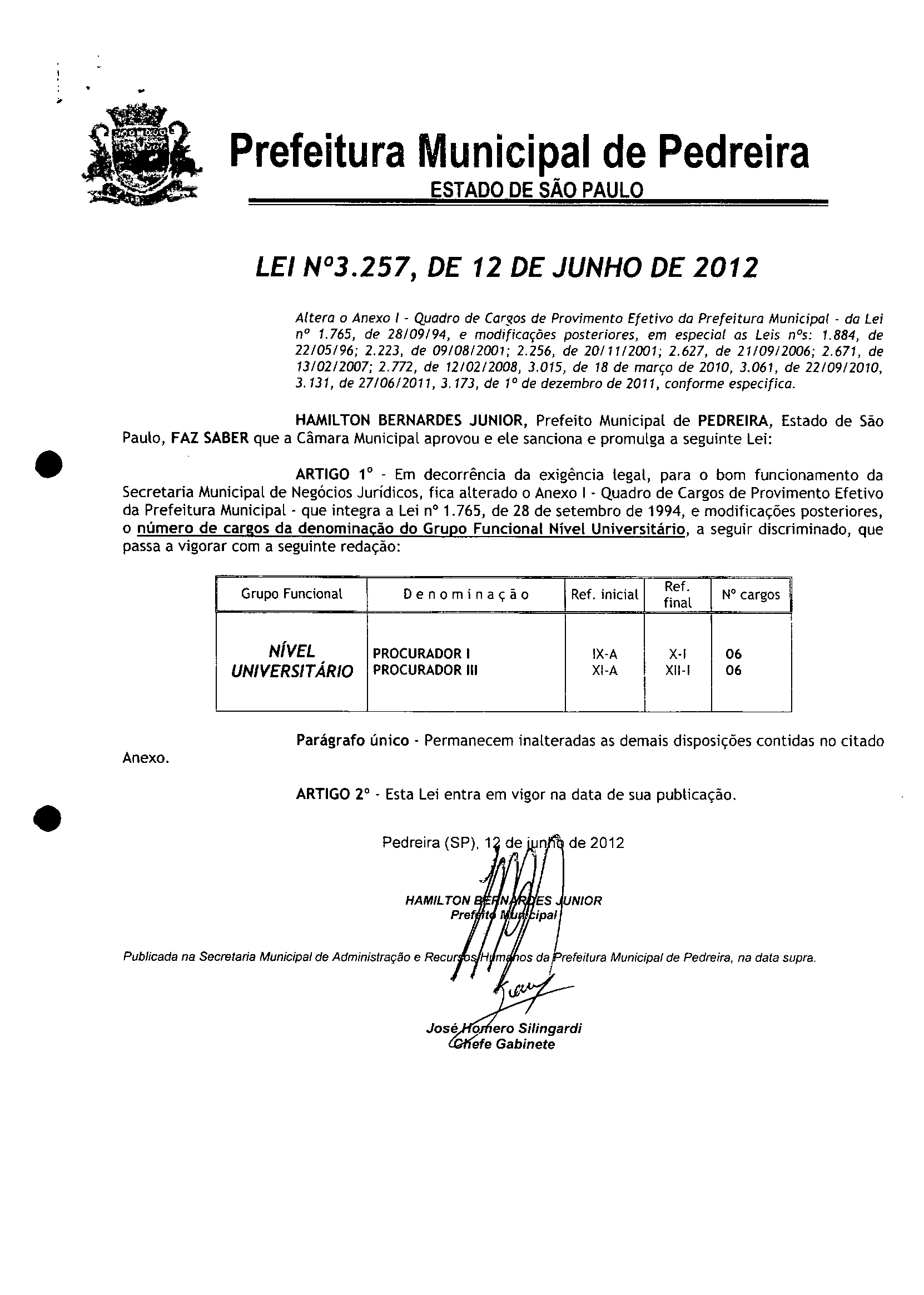 Ementa: Altera o Anexo I - Quadro de Cargos de Provimento Efetivo da Prefeitura Municipal - da Lei nº 1.765, de 28/09/94, e modificações posteriores, em especial as Leis nºs: 1.884, de 22/05/96; 2,223, de 09/08/2001; 2.256, de 20/11/2001; 2.627, de 21/09/2006; 2.671, de 13/02/2007; 2.772, de 12/02/2008, 3.015, de 18 de março de 2010, 3.061, de 22/09/2010, 3.131, de 27/06/2011,3.173, de 1º de dezembro de 2011, conforme especifica,