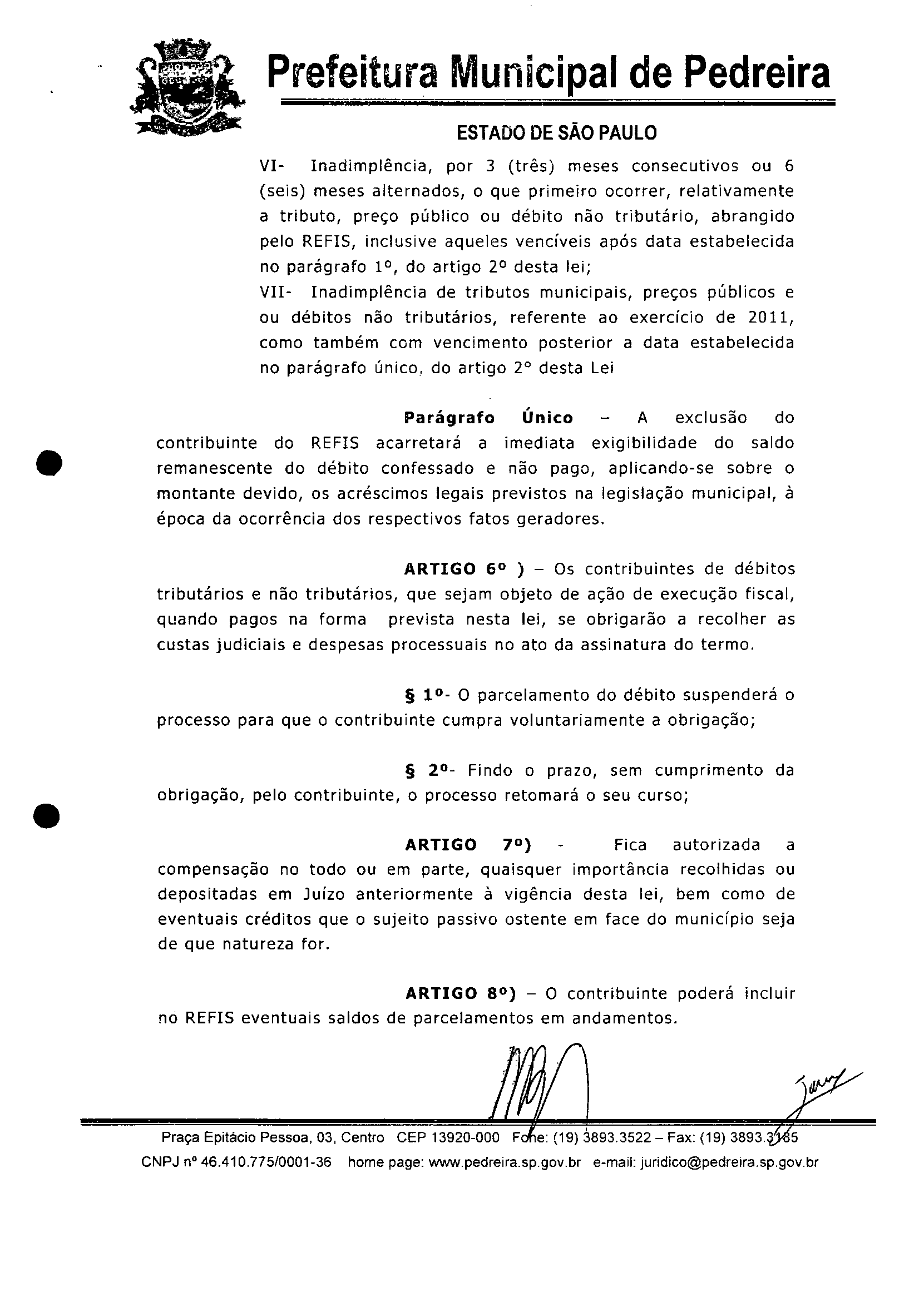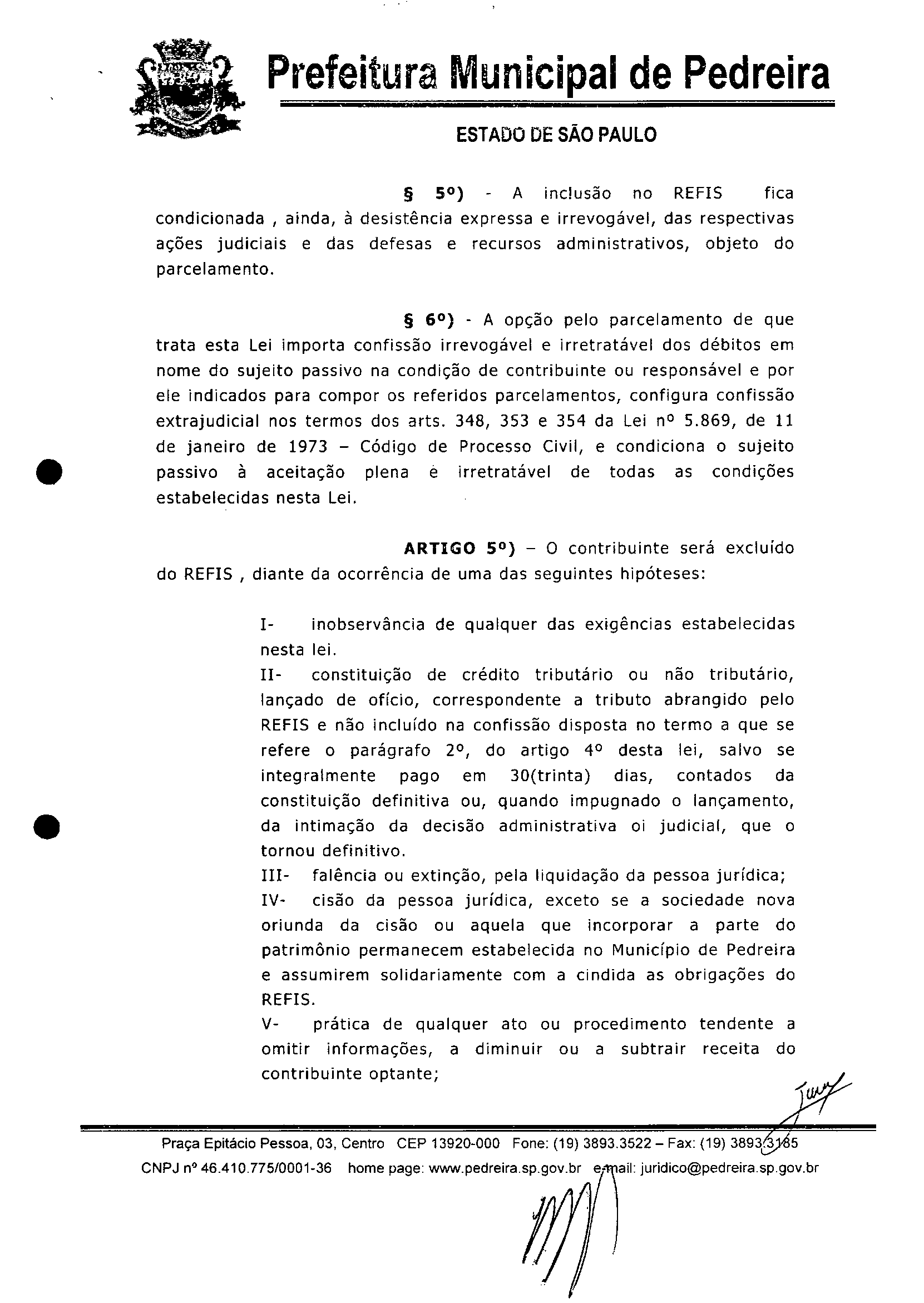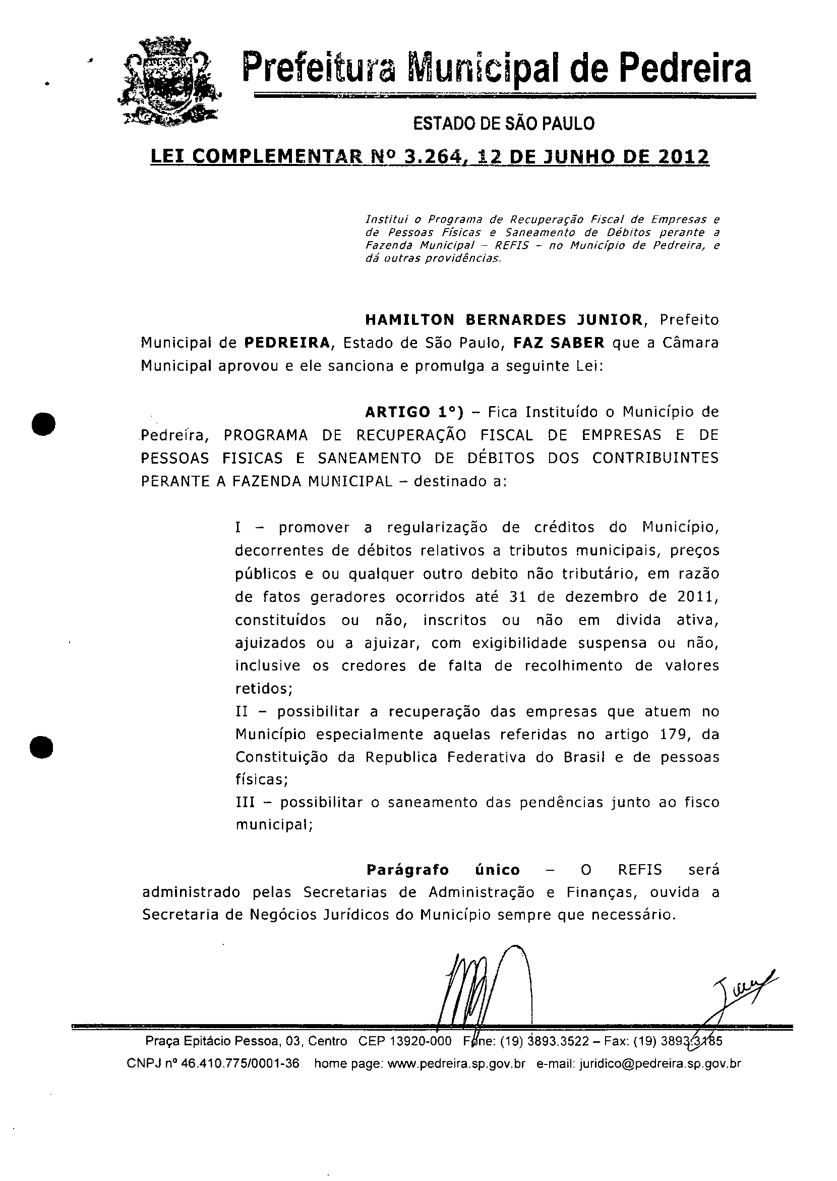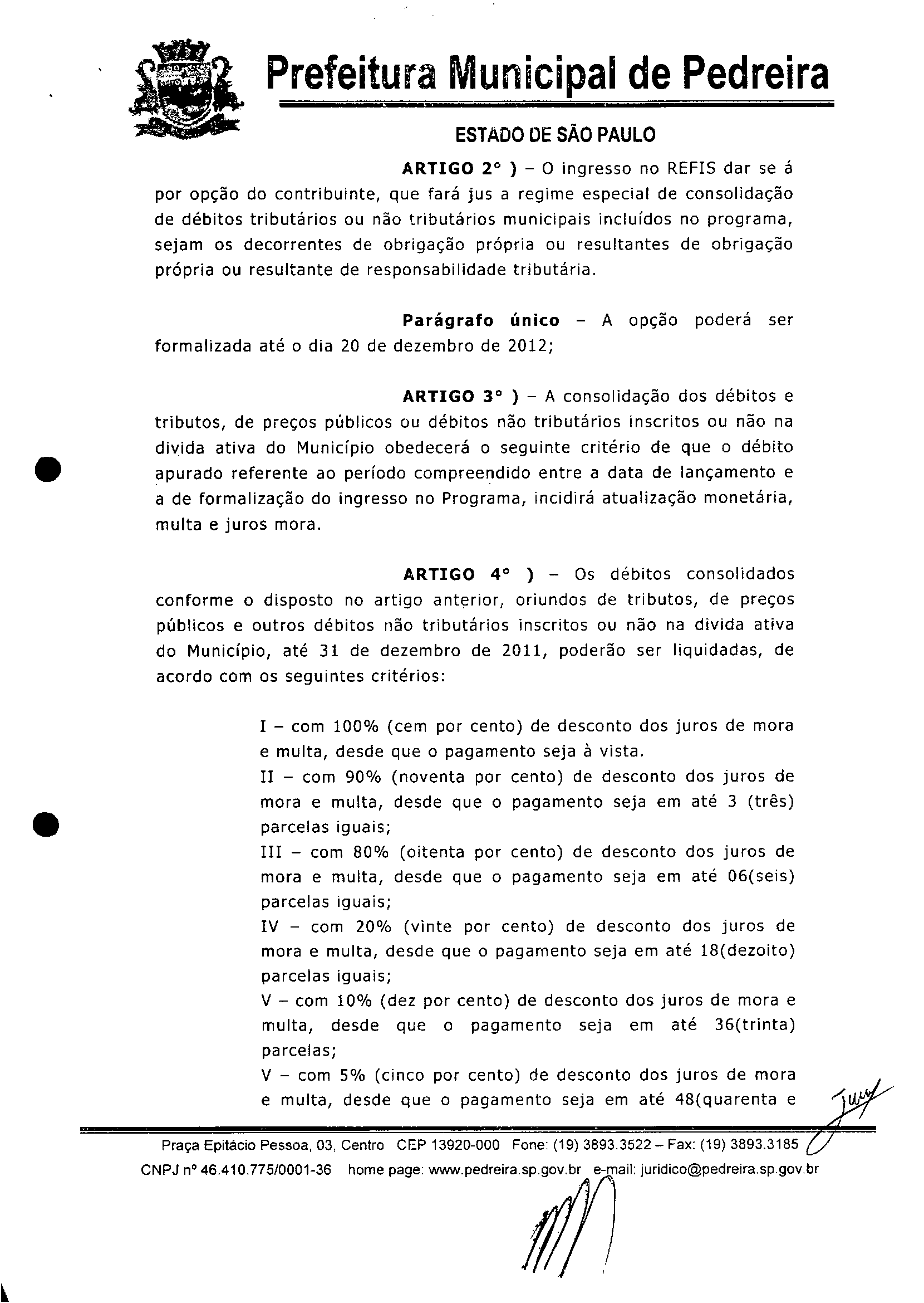 Ementa: Institui o Programa de Recuperação Fiscal de Empresas e de Pessoas Físicas e Saneamento de Débitos perante a Fazenda Municipal -REFIS - no Município de Pedreira; e dá outras providências.