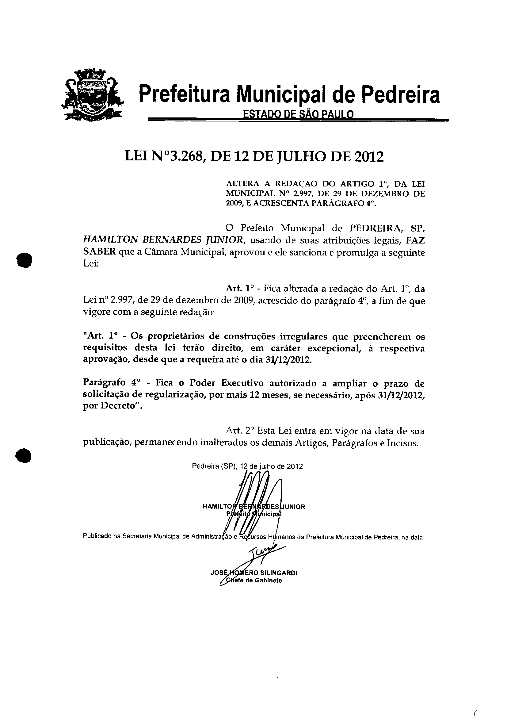 Ementa: ALTERA A REDAÇÃO DO ARTIGO 1º, DA LEI MUNICIPAL N° 2.997, DE 29 DE DEZEMBRO DE 2009, E ACRESCENTA PARÁGRAFO 4°.