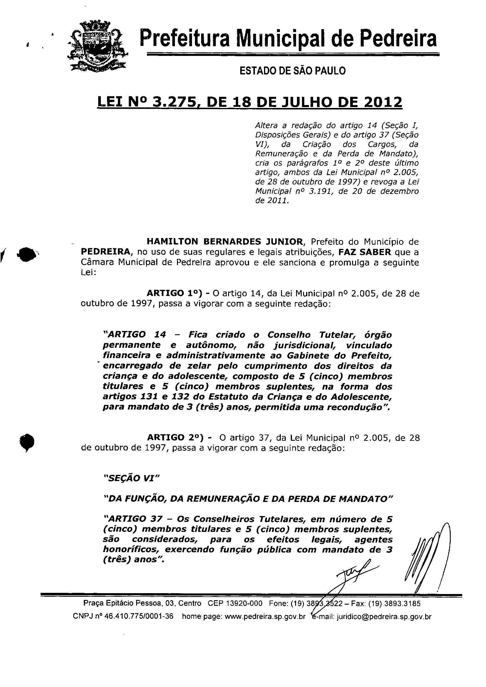 Lei Municipal - N° 3275 de 18/07/2012
