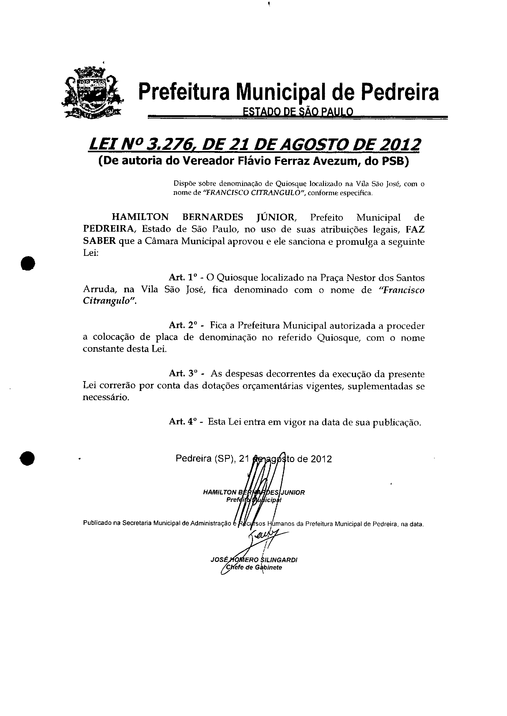 Lei Municipal - N° 3276 de 21/08/2012