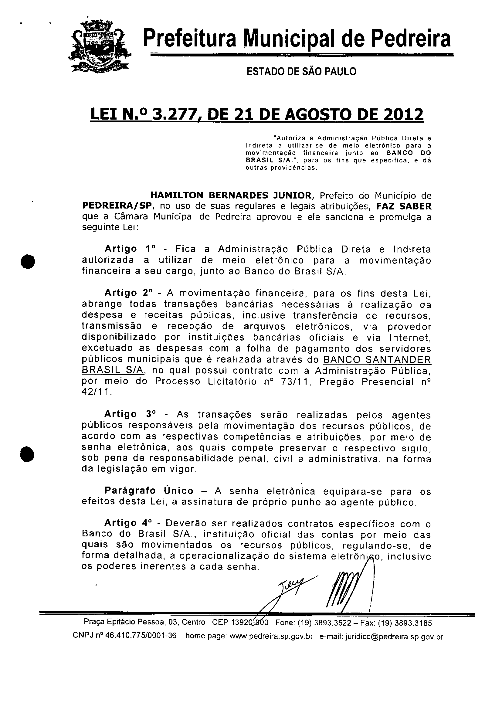 Ementa: "Autoriza a Administração Pública Direta e Indireta a utilizar-se de meio eletrônico para a movimentação financeira junto ao BANCO DO BRASIL S/A.", para os fins que especifica. e dá outras providências.