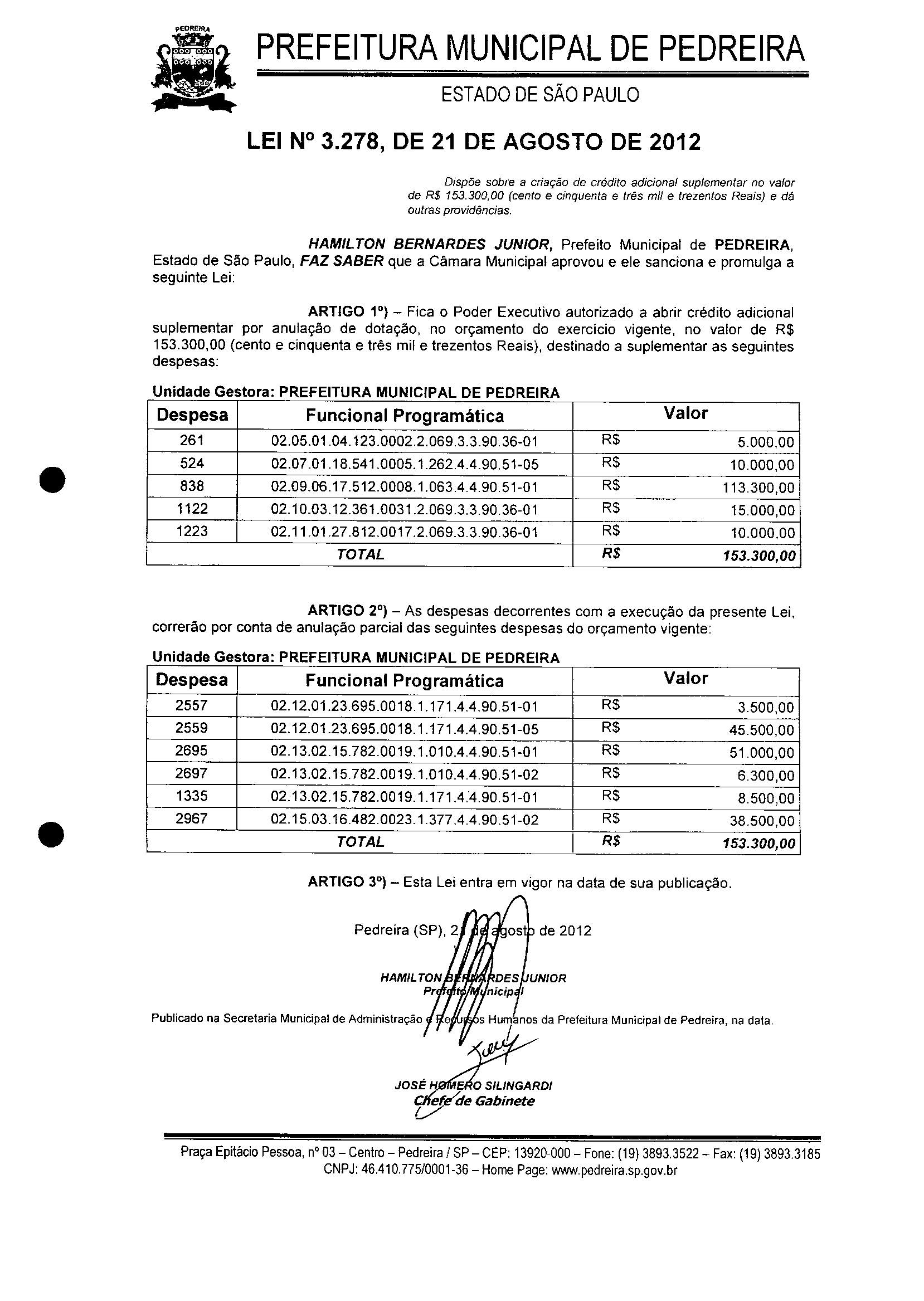 Ementa: Dispõe sobre a criação de crédito adicional suplementar no valor de R$ 153.300,00 (cento e cinquenta e três mil e trezentos Reais) e dá outras providências.