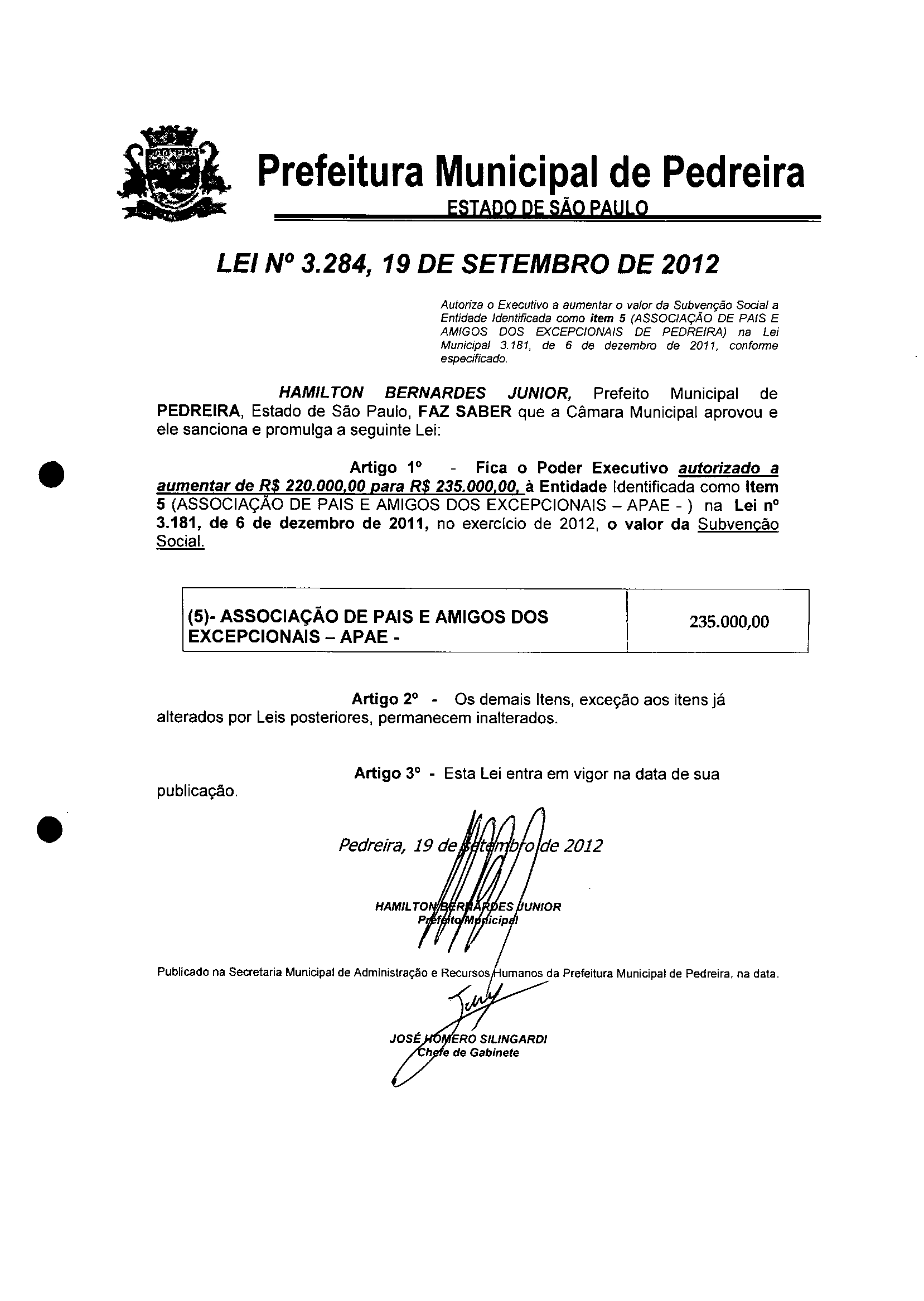 Ementa: Autoriza o Executivo a aumentar o valor da Subvenção Social a Entidade Identificada como item 5 (ASSOCIAÇÃO DE PAIS E AMIGOS DOS EXCEPCIONAIS DE PEDREIRA) na Lei Municipal 3.181, de 6 de dezembro de 2011, conforme especificado.