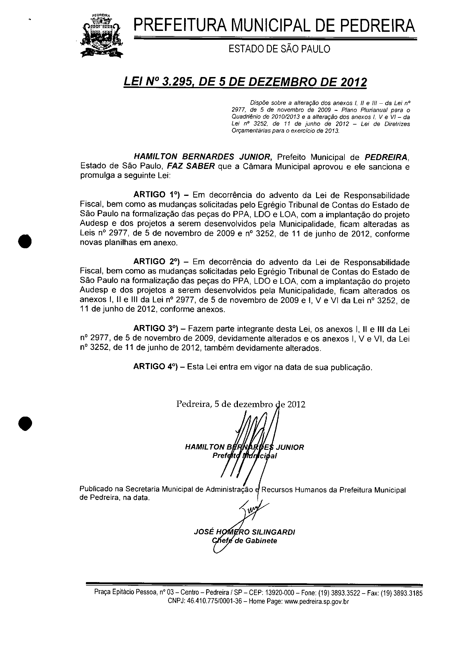 Ementa: Dispõe sobre a alteração dos anexos I, II e III -da Lei nº 2977, de 5 de novembro de 2009 -Plano Plurianual para o Quadriênio de 2010/2013 e a alteração dos anexos I, Ve VI-da Lei nº 3252, de 11 de junho de 2012 -Lei de Diretrizes Orçamentarias para o exercício de 2013.