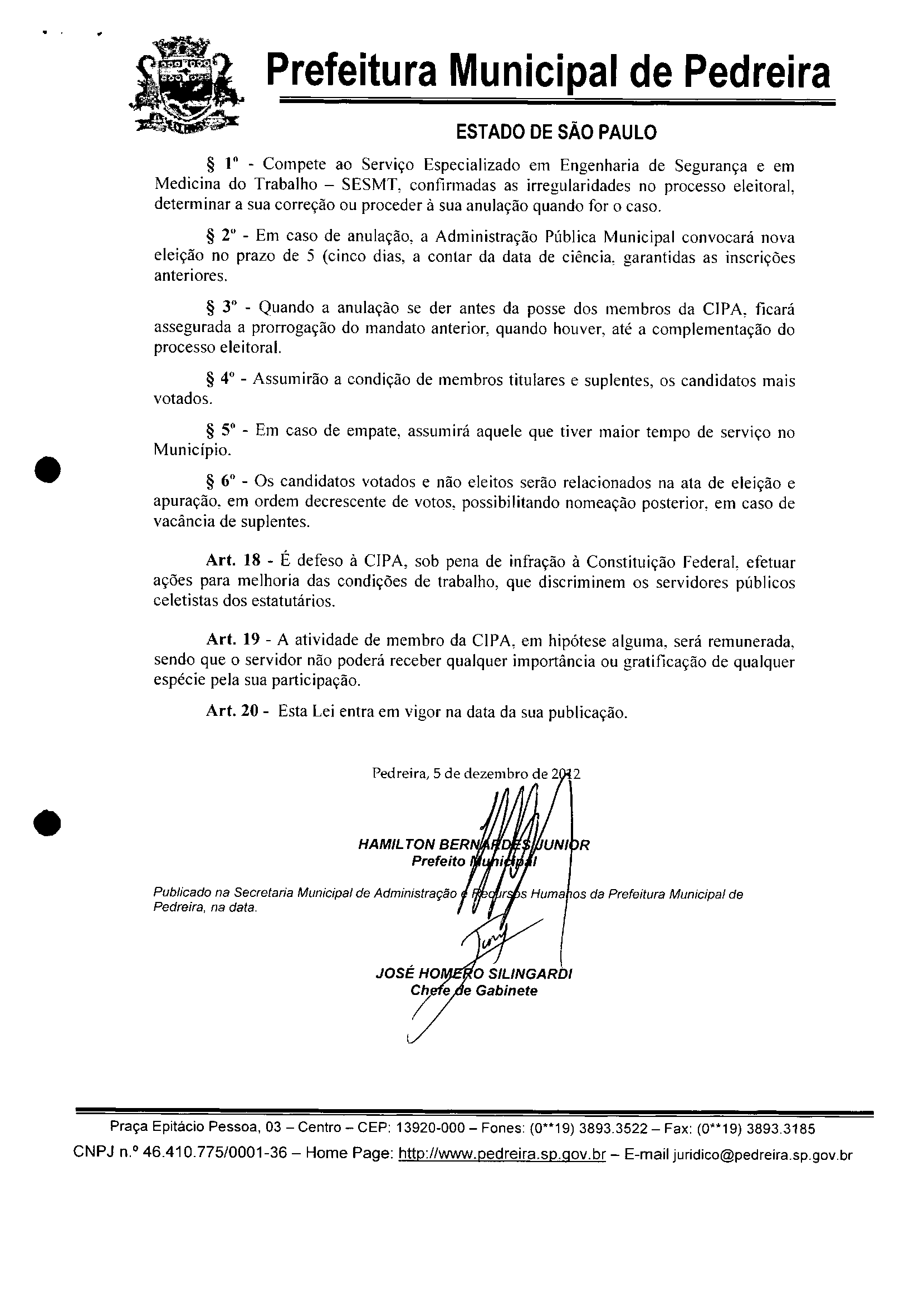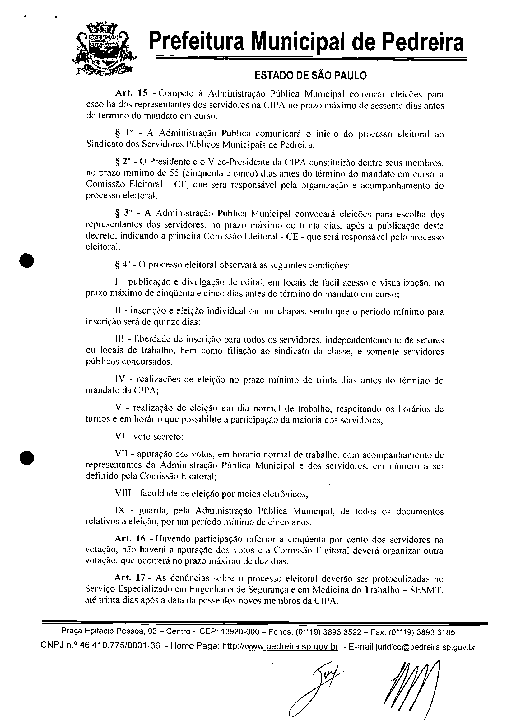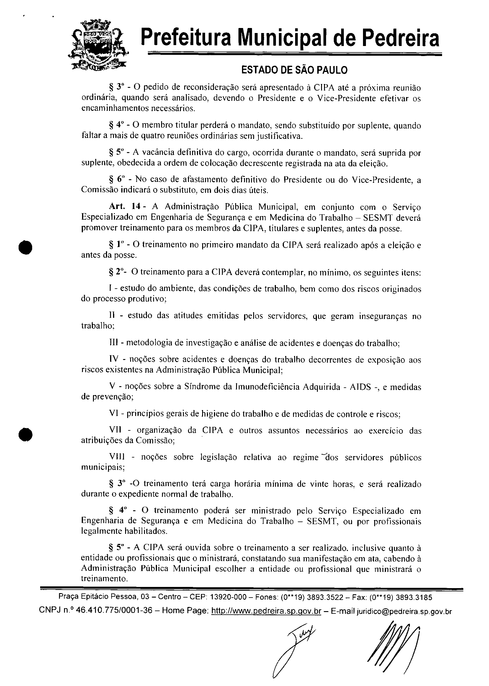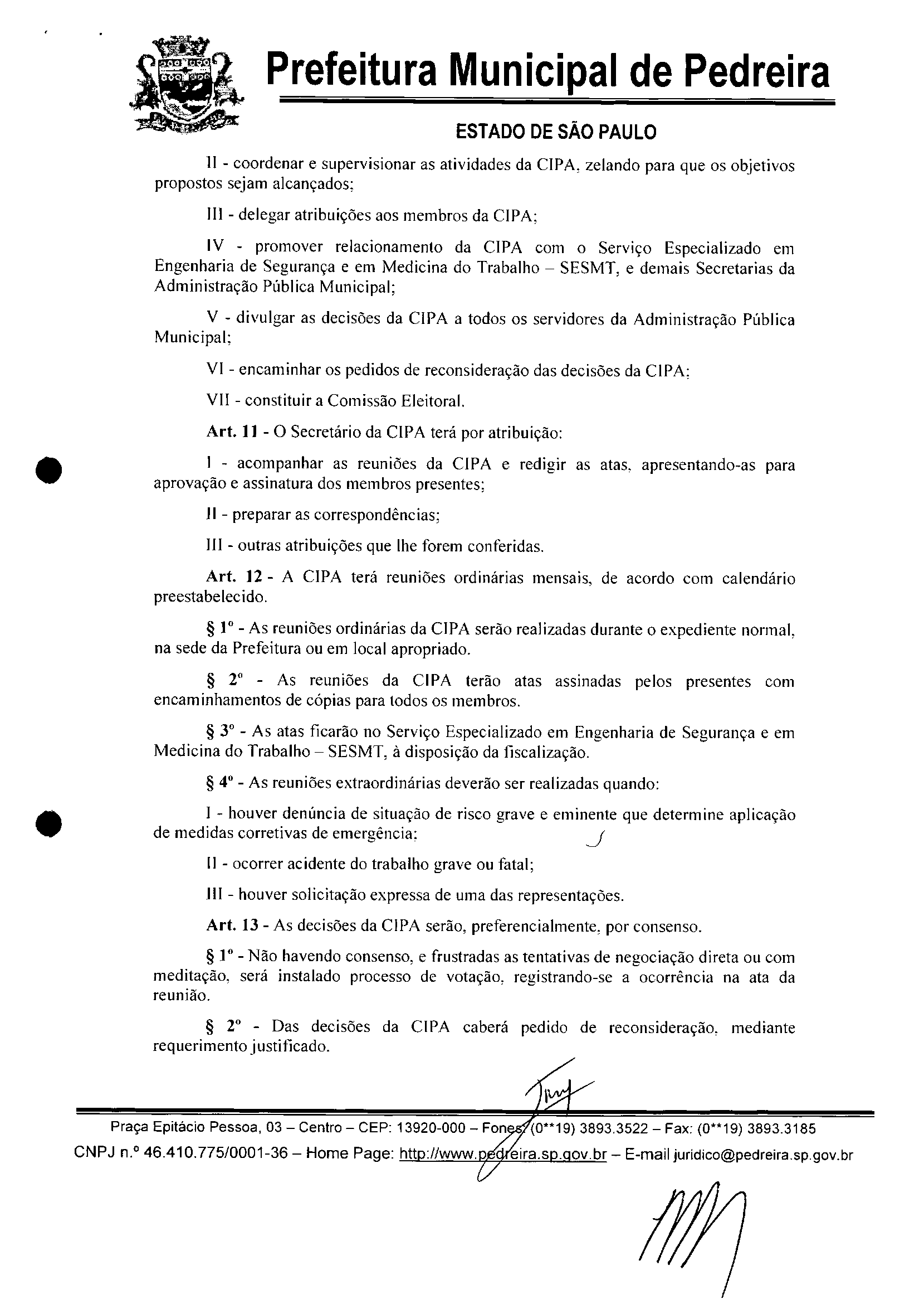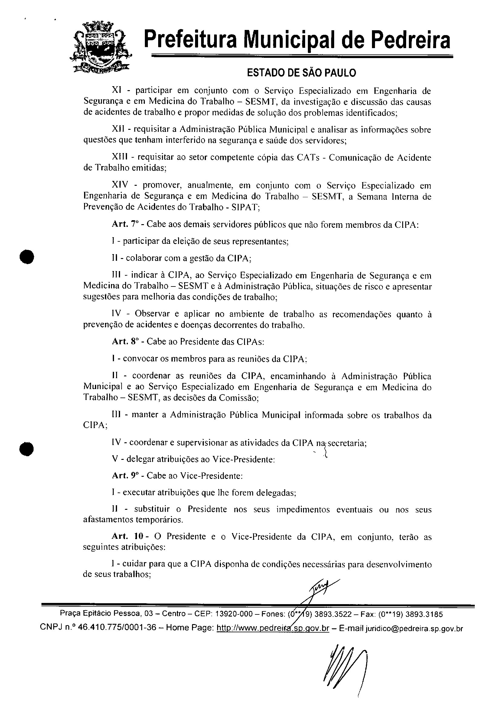 Ementa: INSTITUI A COMISSÃO INTERNA DE PREVENÇÃO DE ACIDENTES -CIPA NO ÃMBlTO DA ADMINISTRAÇÃO DO MUNiCíPIO DE PEDREIRA E DA OUTRAS -PROVIDENCIAS
