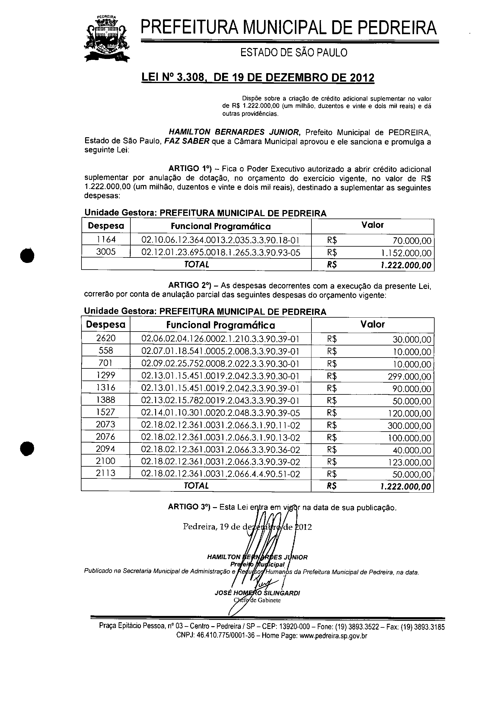 Ementa: Dispõe sobre a criação de crédito adicional suplementar no valor de R$ 1.222.000,00 (um milhão, duzentos e vinte e dois mil reais) e dá outras providências.