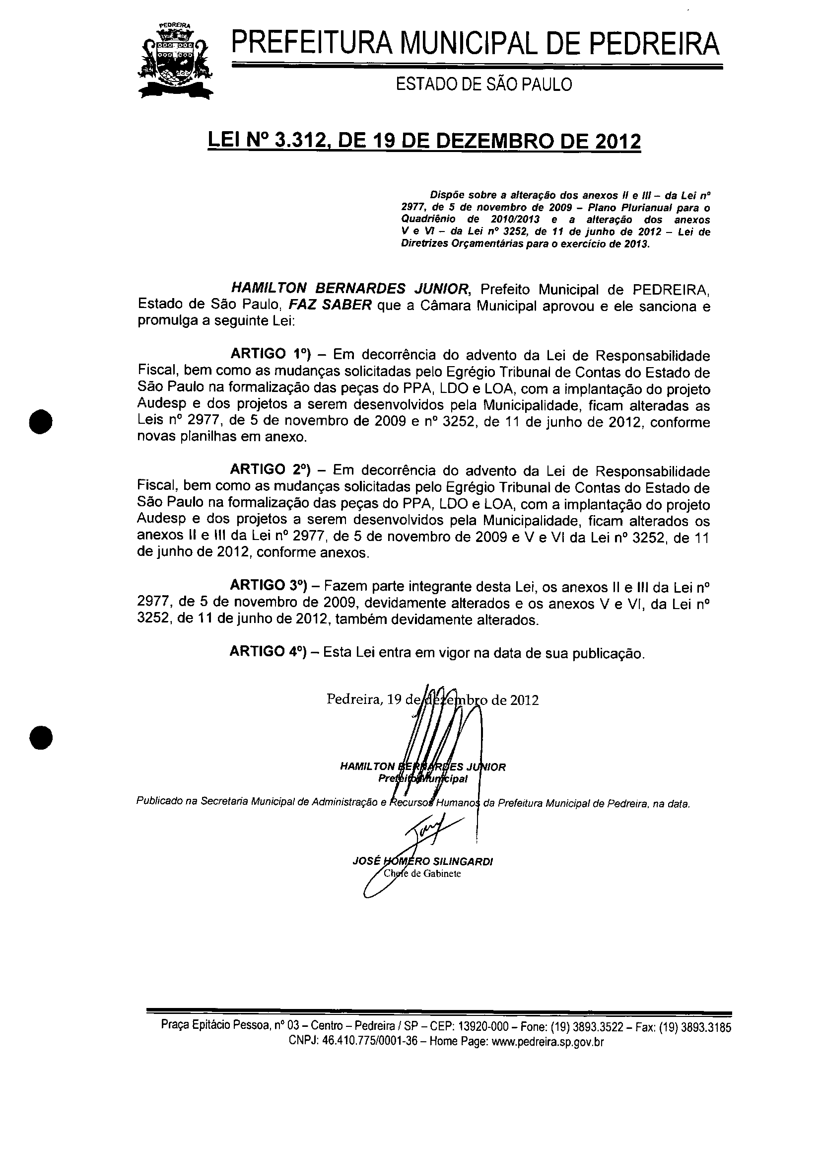 Lei Municipal - N° 3312 de 19/12/2012