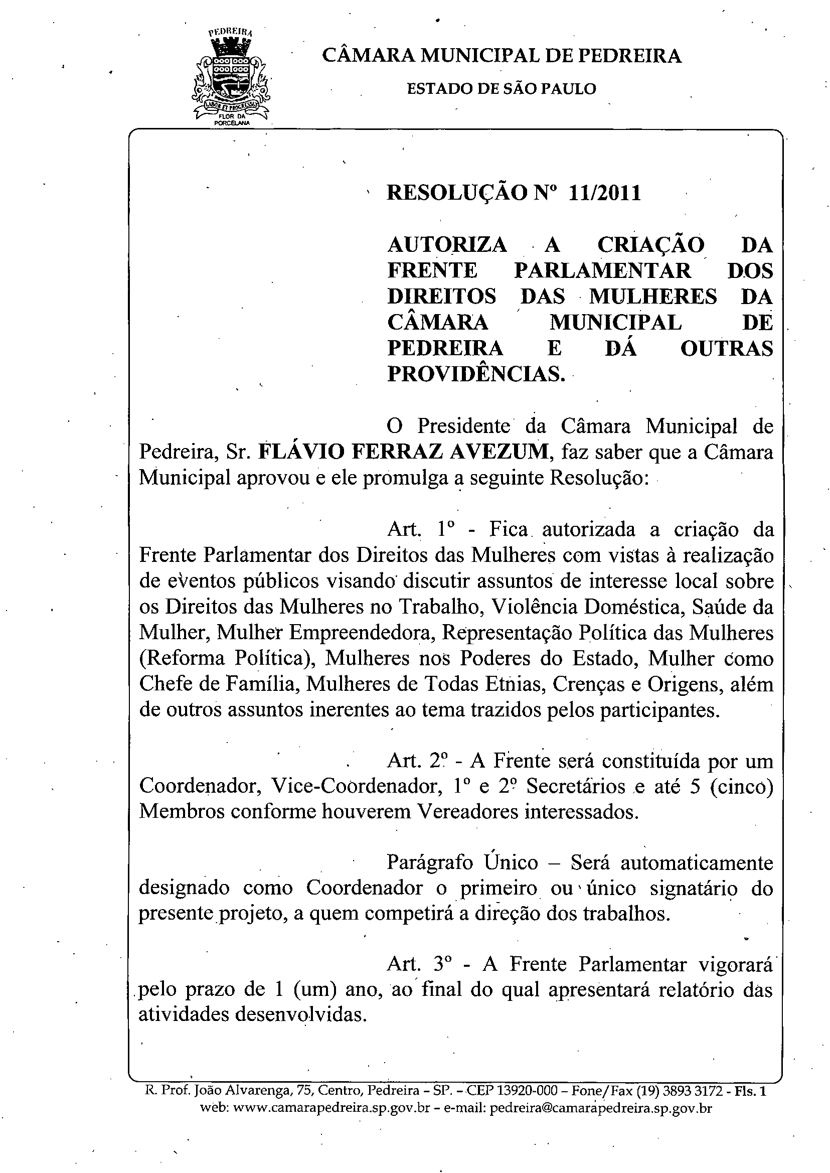 Ementa: AUTORIZA A CRIAÇÃO DA FRENTE PARLAMENTAR DOS DIREITOS DAS• MULHERES DA CAMARA MUNICIPAL DE PEDREIRA E DA OUTRAS PROVIDENCIAS ..