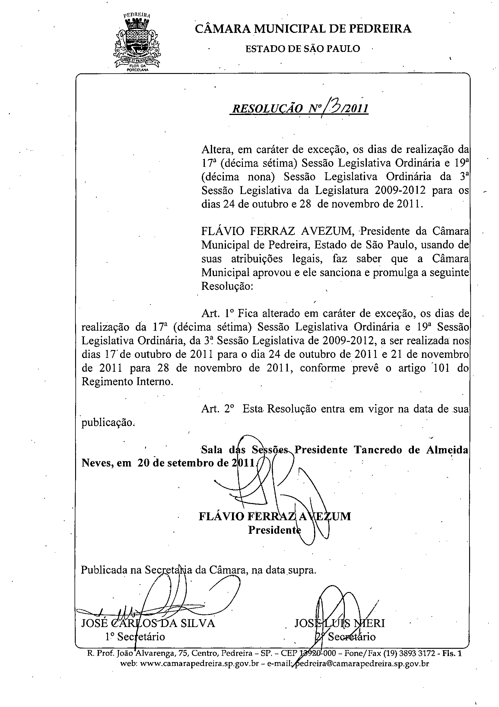 Ementa: Altera, em caráter de exceção, os dias de realização da 17a (décima sétima) Sessão Legislativa Ordinária e 19ª (décima nona) Sessão Legislativa Ordiriária da 3ª Sessão Legislativa da Legislatura 2009-2012 para dias 24 de outubro e 28 de novembro de 2011.