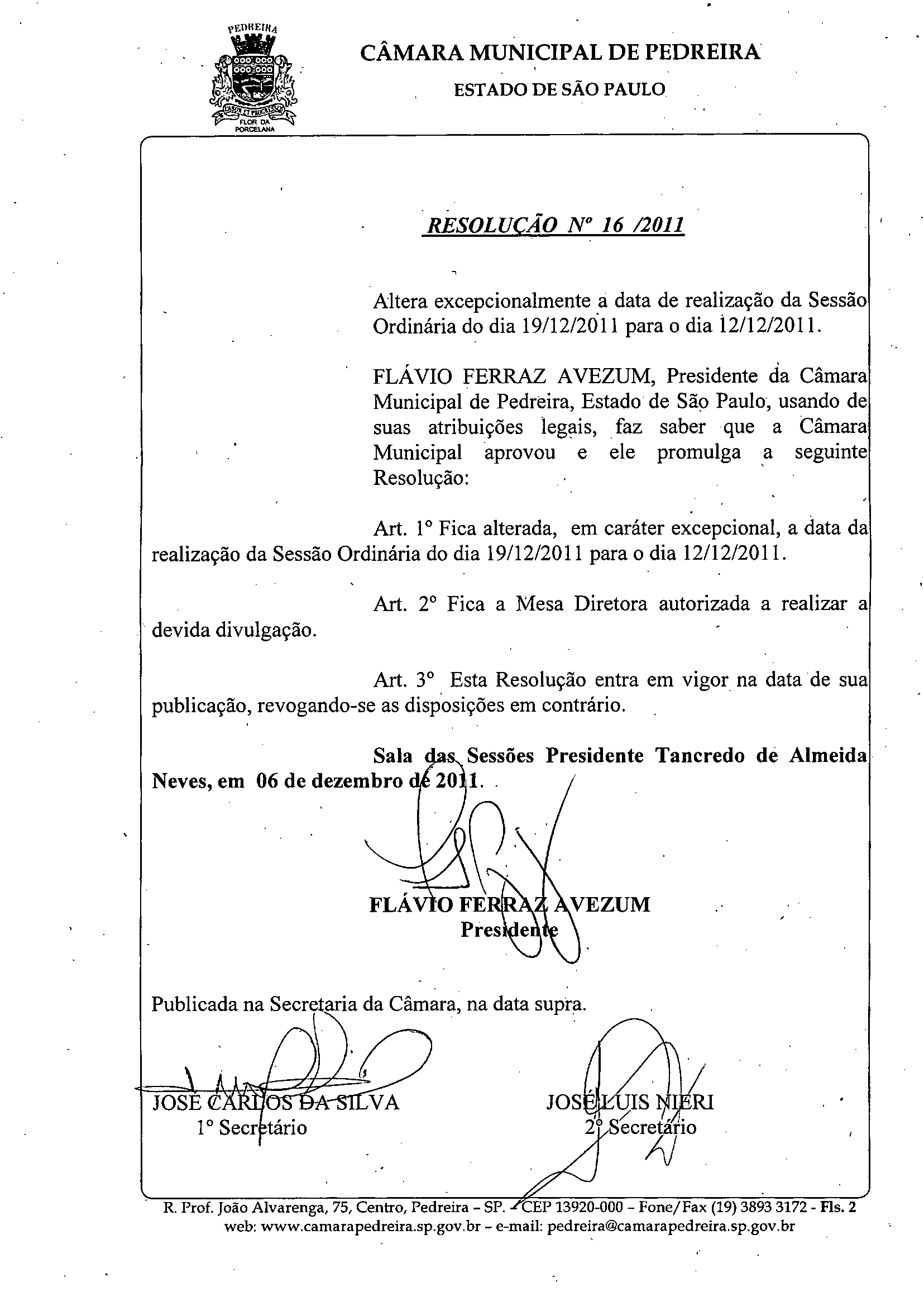 Ementa: Altera excepcionalmente a data de realização da Ordinária do dia 19/12/2011 para o dia 12/12/2011