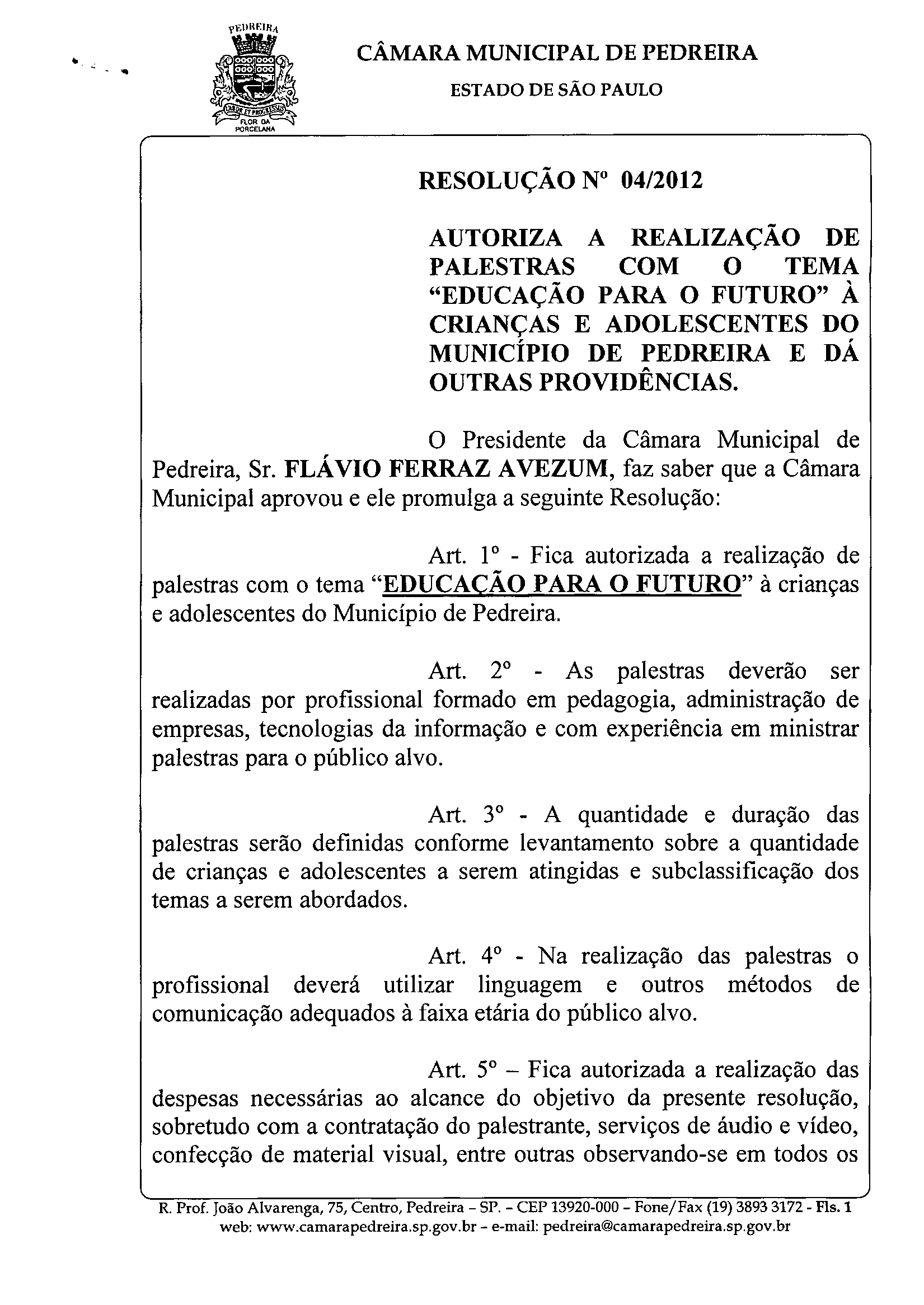 Ementa: AUTORIZA A REALIZAÇÃO DE PALESTRAS COM O TEMA , "EDUCAÇAO PARA O FUTURO" A CRIANÇAS E ADOLESCENTES DO MUNICIPIO DE PEDREIRA E DA OUTRAS PROVIDENCIAS.