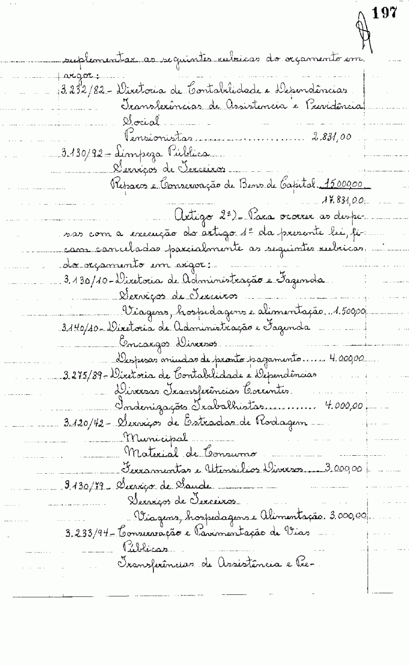 Ementa: Artigo 1º - Fica o Poder Executivo autorizado a proceder a abertura de um crédito no valor de Cr$ 17.831,00 (dezessete mil, oitocentos e trinta e hum cruzeiros), destinado a suplementar as seguintes rubricas do orçamento vigente.