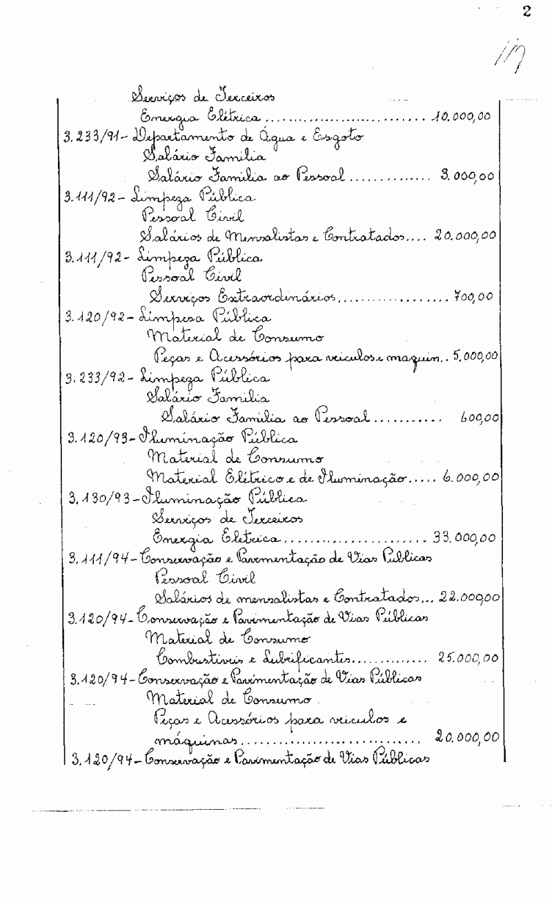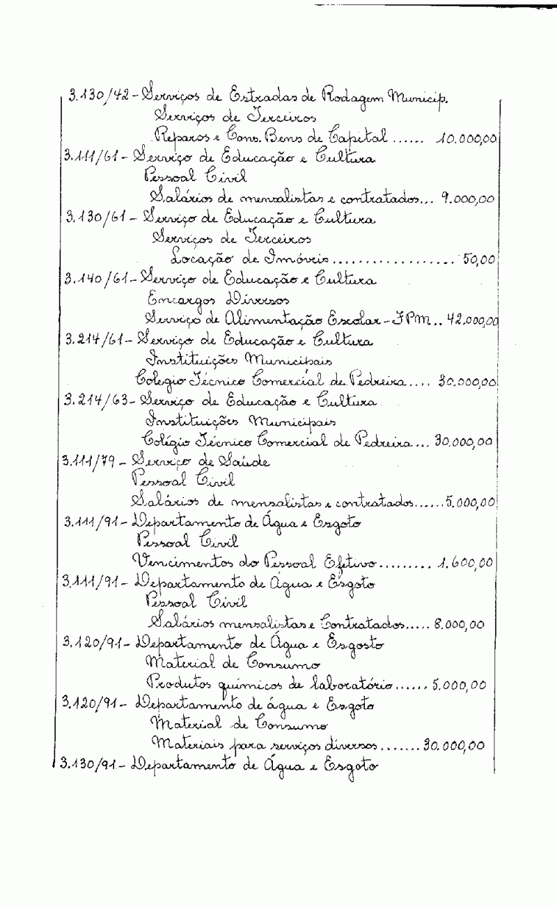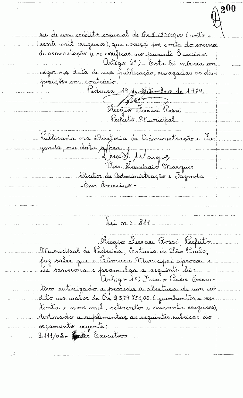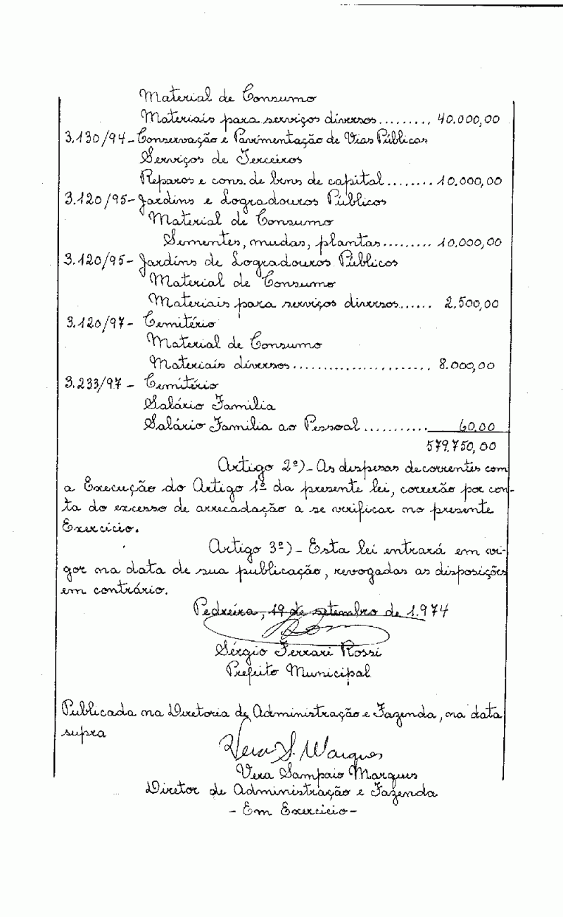 Ementa: Artigo 1º - Fica o Poder Executivo autorizado a proceder a abertura de um crédito no valor de Cr$ 579.750,00 (quinhentos e setenta e nove mil, setecentos e cinquenta cruzeiros), destinado a suplementar as seguintes rubricas do orçamento vigente.
