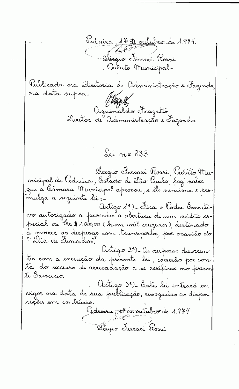 Ementa: Artigo 1º - Fica o Poder Executivo autorizado a proceder a abertura de um crédito especial de Cr$ 1.000,00 (hum mil cruzeiros), destinado a ocorrer as despesas com transportes, por ocasião do "Dia de Finados".