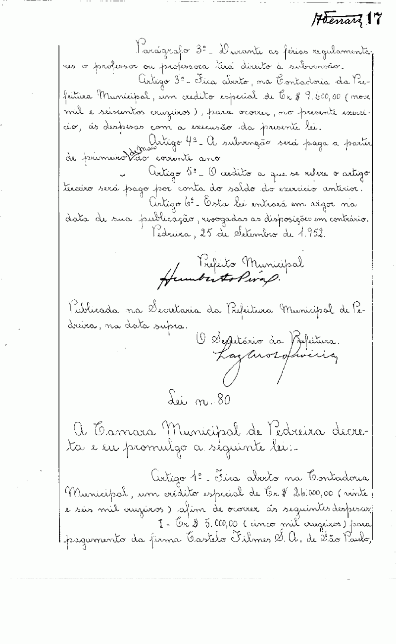 Ementa: Artigo 1º - Fica aberto na Contadoria Municipal, um crédito especial de Cr$ 26.000,00 (vinte e seis mil cruzeiros) afim de ocorrer às seguintes despesas.