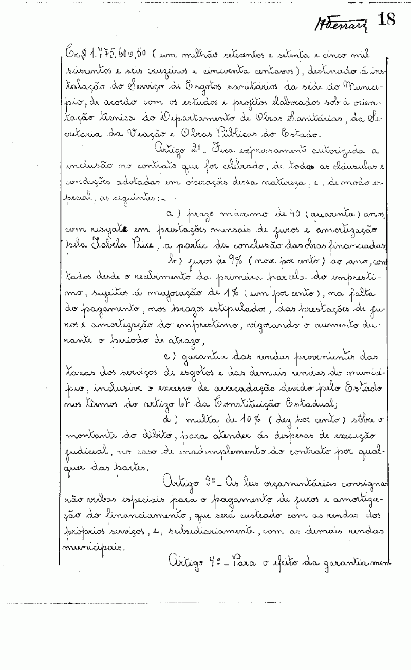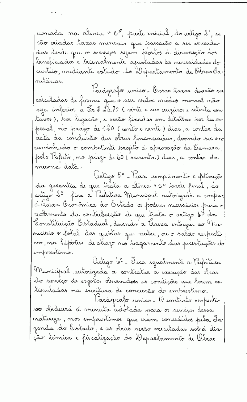 Ementa: Artigo 1º - Fica a Prefeitura Municipal autorizada a contratar com a Caixa Econômica do Estado de São Paulo, um empréstimo até a importância de Cr$ 1.775.606,50 (um milhão setecentos e setenta e cinco mil, seiscentos e seis cruzeiros e cinquenta centavos), destinado à instalação do Serviço de Esgotos Sanitários da Sede do Município, de acordo com os estudos e projetos elaborados sob a orientação técnica do Departamento de Obras Sanitárias, da Secretaria de Viação e Obras Públicas do Estado.