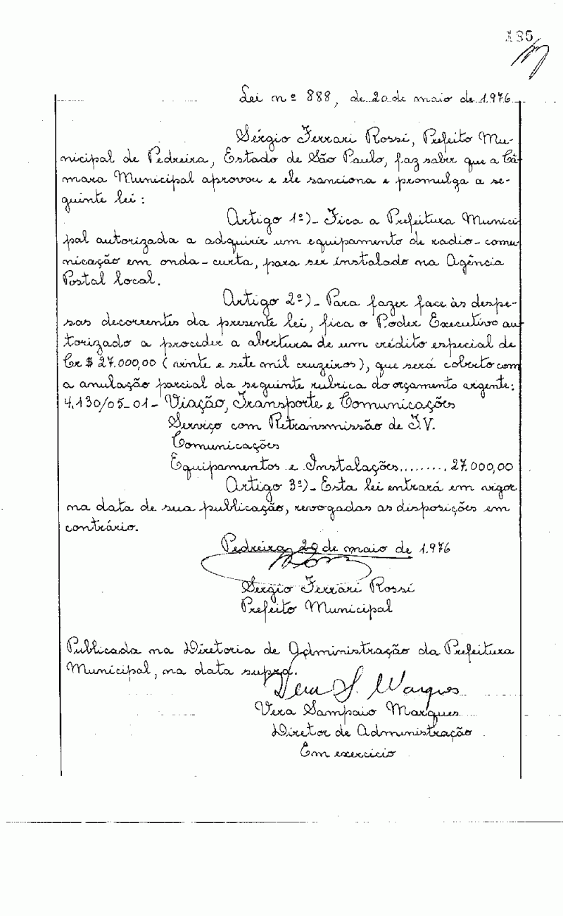 Ementa: Artigo 1º - Fica a Prefeitura Municipal autorizada a adquirir um equipamento de rádio-comunicação em onda-curta, para ser instalado na Agência Postal local.