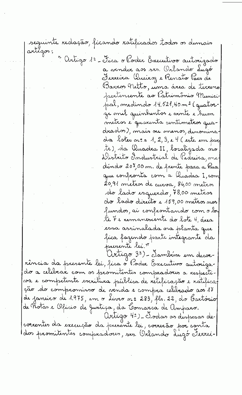 Ementa: Artigo 1º - Fica o Poder Executivo autorizado a permutar, com os srs. Orlando Lugo Ferreira Queiroz e Renato Paes de Barros Netto, prominentes compradores dos lotes nºs 1, 2, 3 e 4 (parte) da Quadra II, do Distrito Industrial.