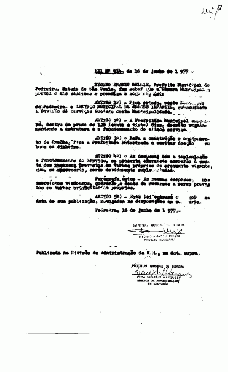 Ementa: Artigo 1º - Fica criado, neste Município de Pedreira, o Serviço Municipal de Creche Infantil, subordinado a Divisão de Serviços Sociais desta Municipalidade.