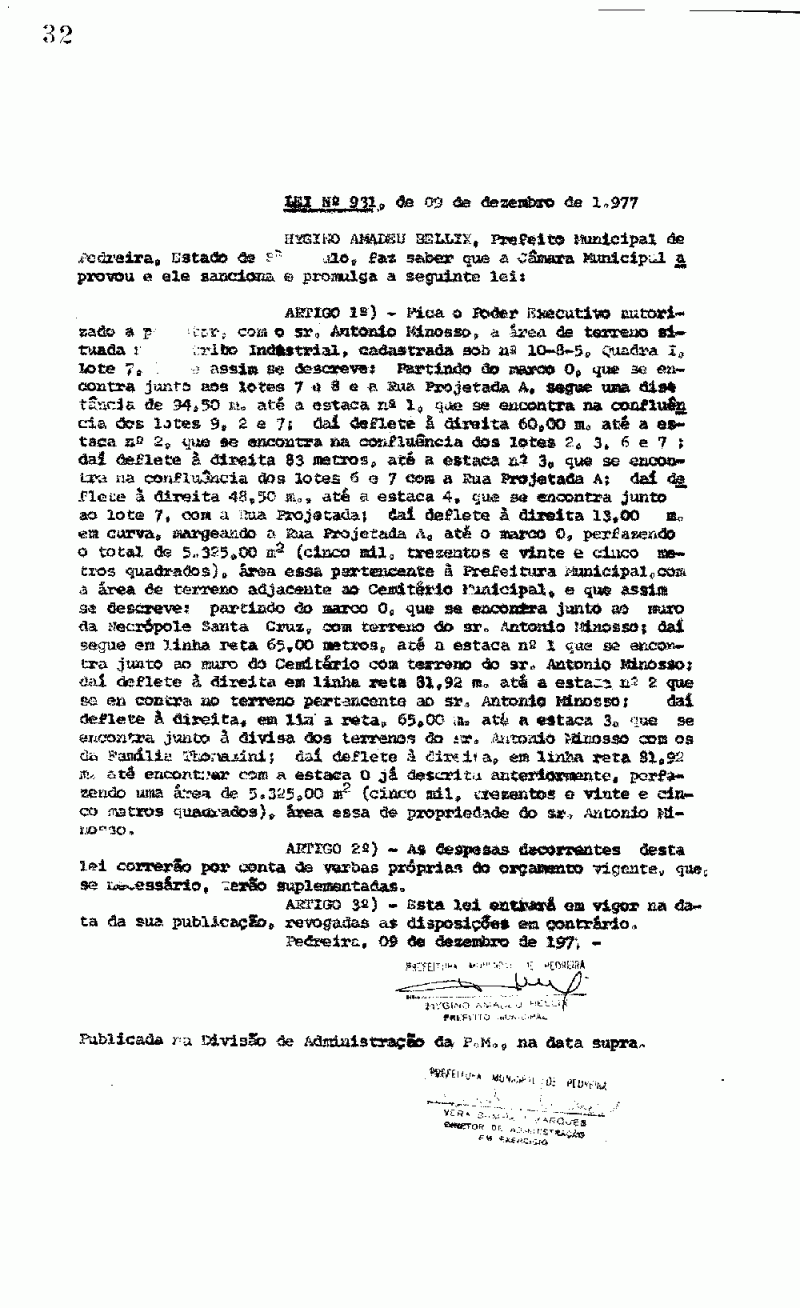 Ementa: Artigo 1º - Fica o Poder Executivo autorizado a permutar, com o sr. Antonio Minosso, a área de terreno situada no Distrito Industrial, cadastrada sob nº 10-8-5, Quadra I, lote 7, que assim se descreve.