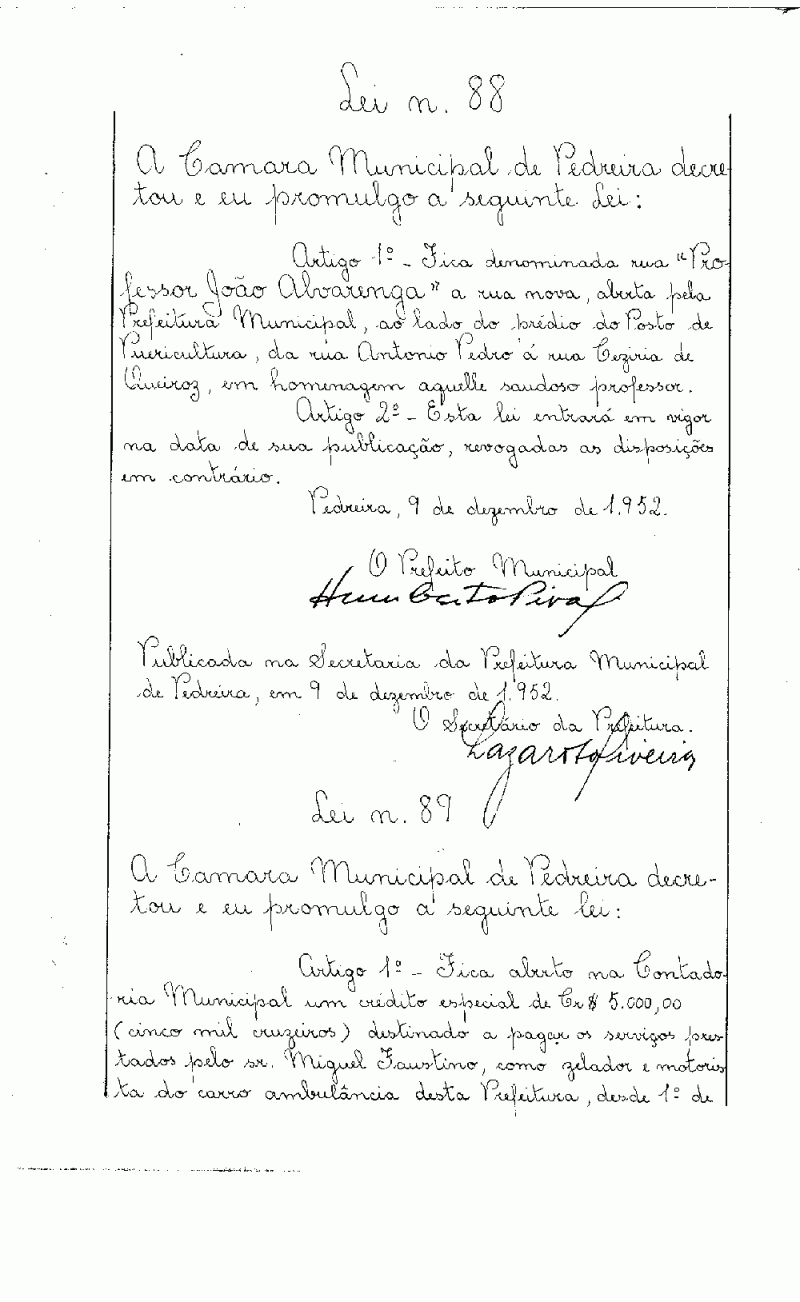 Ementa: Artigo 1º - Fica denominada Rua "Professor João Alvarenga" a rua nova, aberta pela Prefeitura Municipal, ao lado do prédio do Posto de Puericultura, da rua Antonio Pedro à rua Ceziria de Queiroz, em homenagem aquele saudoso professor.