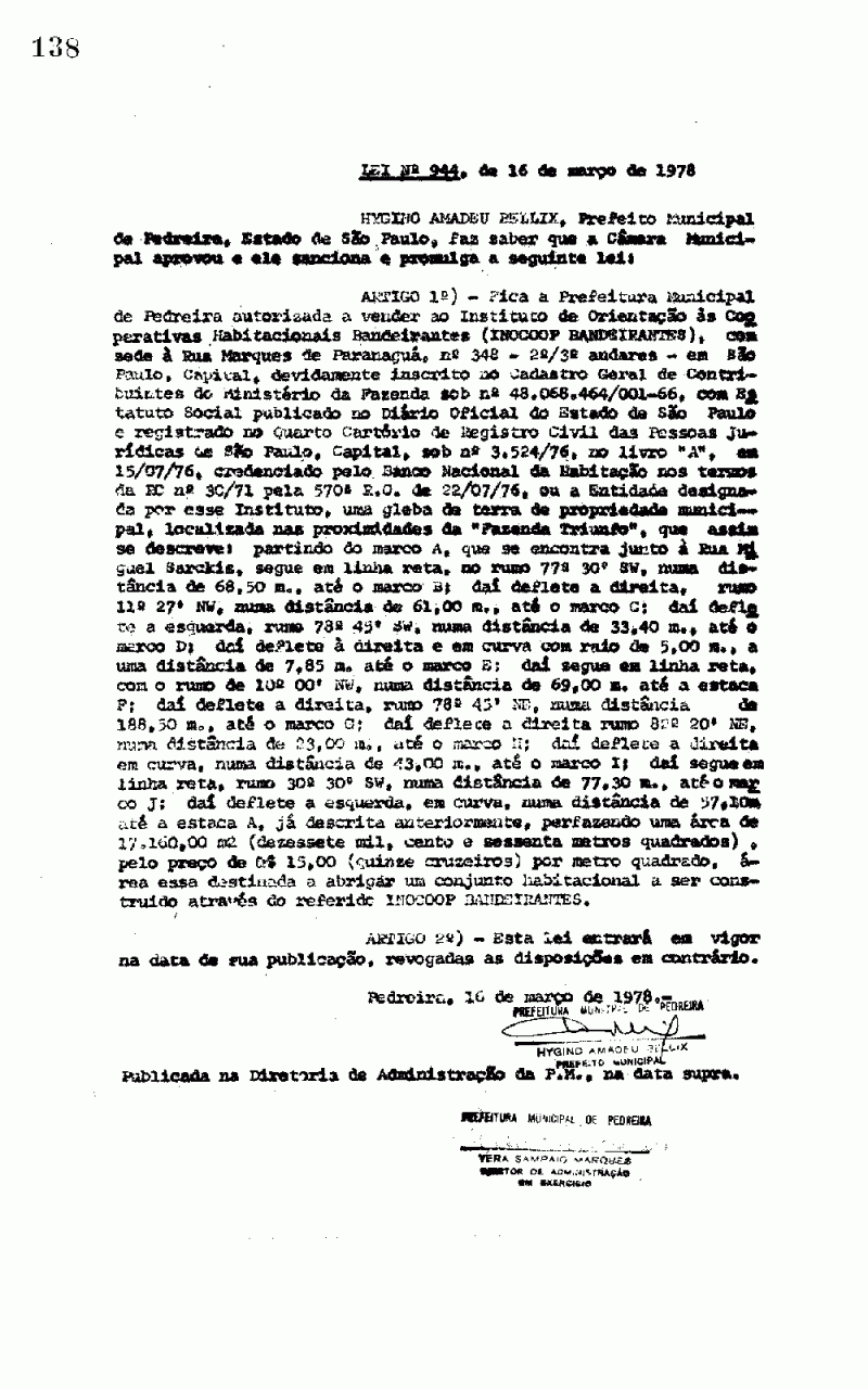 Ementa: Artigo 1º - Fica a Prefeitura Municipal de Pedreira autorizada a vender gleba de terra ao Instituto de Orientação às Cooperativas Habitacionais Bandeirantes (INOCOOP Bandeirante).