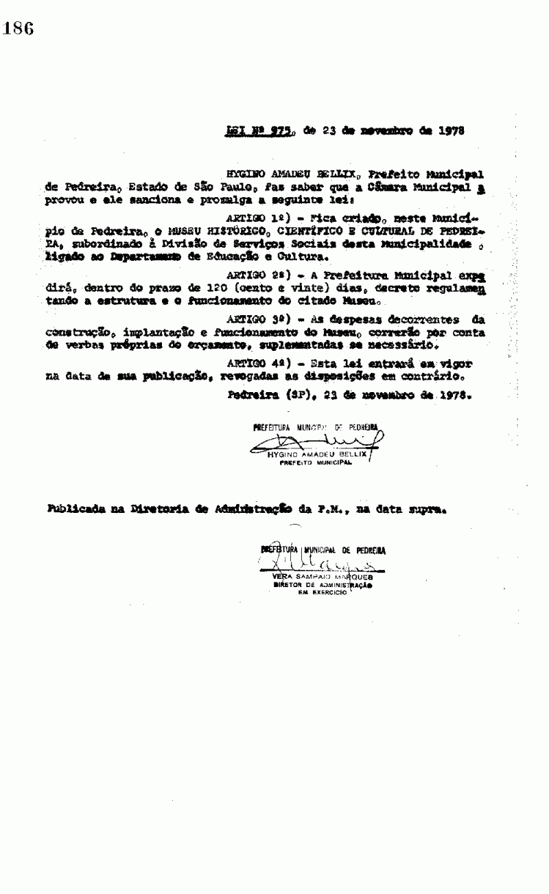 Ementa: Artigo 1º - Fica criado, neste Município de Pedreira, o Museu Histórico, Científico e Cultural de Pedreira, subordinado à Divisão de Serviços Sociais desta Municipalidade, ligado ao Departamento de Educação e Cultura.