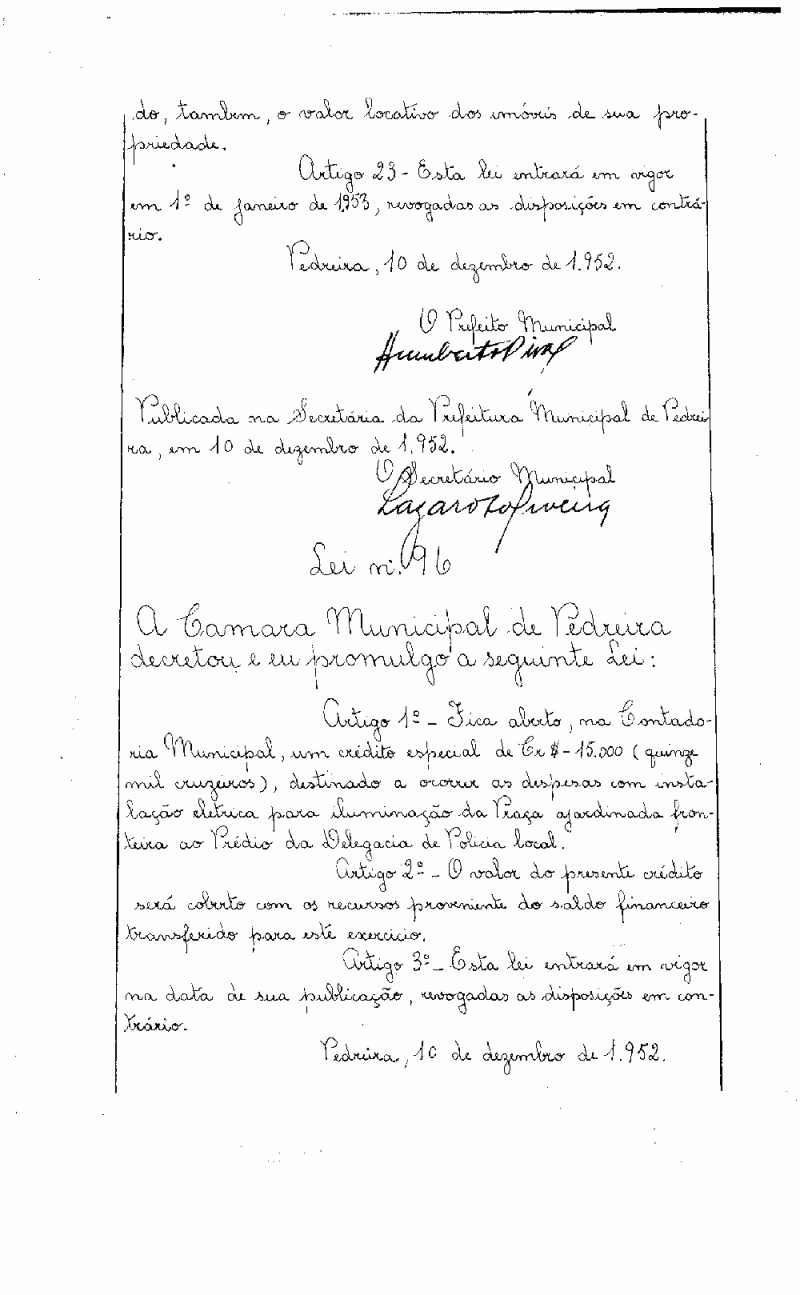 Ementa: Artigo 1º - Fica aberto, na Contadoria Municipal, um crédito especial de Cr$ 15.000,00 (quinze mil cruzeiros), destinado a ocorrer as despesas com instalação elétrica para iluminação da Praça ajardinada fronteira ao Prédio da Delegacia de Polícia local.