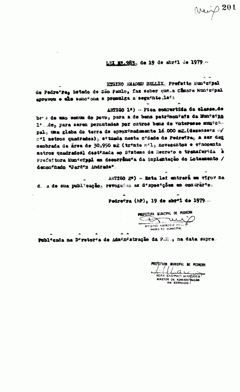 Ementa: Artigo 1º - Fica convertida da classe de bens de uso comum do povo, para a de bens patrimoniais da Municipalidade, para serem permutadas por outros bens de interesse municipal, uma gleba de terra de aproximadamente 16.000 m2 (dezesseis mil metros quadrados), situada nesta cidade de Pedreira, a ser desmembrada da área de 30.950 m2 (trinta mil novecentos e cinquenta metros quadrados) destinada ao Sistema de Recreio e transferida à Prefeitura Municipal em decorrência da implantação do Loteamento denominado "Jardim Andrade".