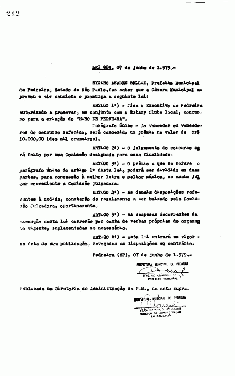 Ementa: Artigo 1º - Fica o Executivo de Pedreira autorizado a promover, em conjunto com o Rotary Clube local, concurso para a criação do "Hino de Pedreira".