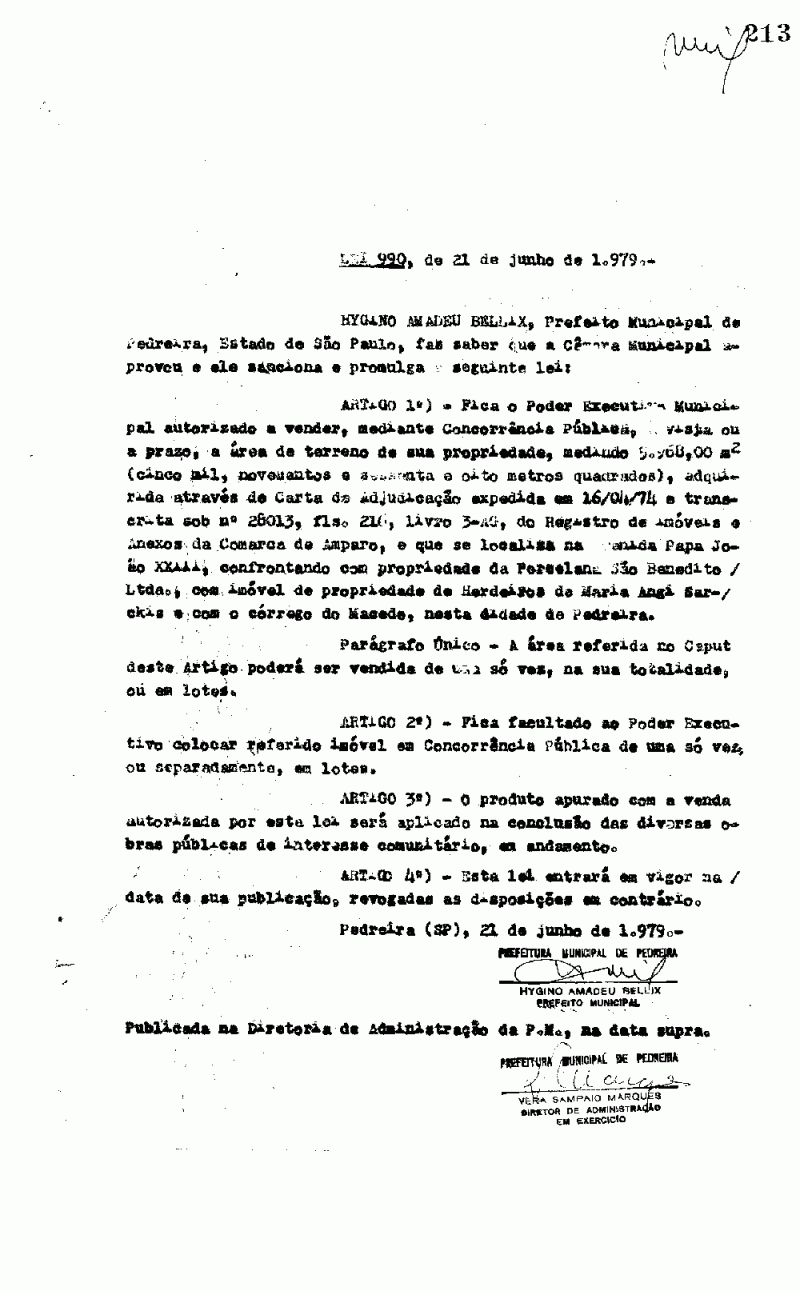 Ementa: Artigo 1º - Fica o Poder Executivo Municipal autorizado a vender, mediante Concorrência Pública, a vista ou a prazo, a área de terreno de sua propriedade, medindo 5.968,00 m2 (cinco mil, novecentos e sessenta e oito metros quadrados), adquiridos através de Carta de Adjudicação expedida em 16/04/74 e transcrita sob nº 28013, fls 216, livro 3-AG, do Registro de Imóveis e Anexos da Comarca de Amparo, e que se localiza na Avenida Papa João XXIII, confrontando com propriedade da Porcelana São Benedito Ltda, com imóvel de propriedade de Herdeiros de Maria Angi Sarckis e com o córrego do Macedo, nesta cidade de Pedreira.