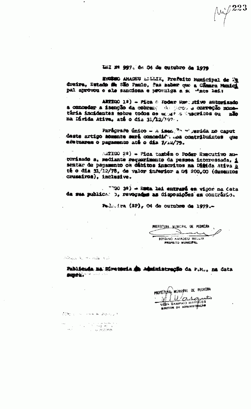 Ementa: Artigo 1º - Fica o Poder Executivo autorizado a conceder a isenção da cobrança de juros e correção monetária incidentes sobre todos os outros inscritos ou não em divida ativa, até o dia 31/12/1978.