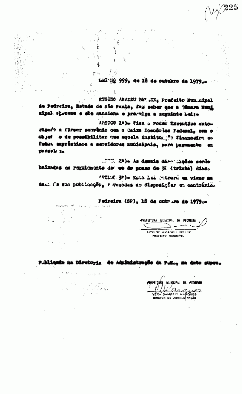 Ementa: Artigo 1º - Fica o Poder Executivo autorizado a firmar convênio com a Caixa Econômica Federal, com o objetivo de possibilitar que aquela instituição financeira efetue empréstimos a servidores municipais, para pagamento em parcelas.