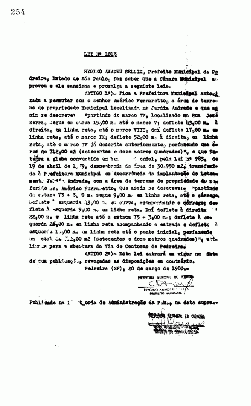 Ementa: Artigo 1º - Fica a Prefeitura Municipal autorizada a permutar com o Senhor Américo Ferraretto, a área de terreno de propriedade municipal localizada no Jardim Andrade e que assim se descreve.