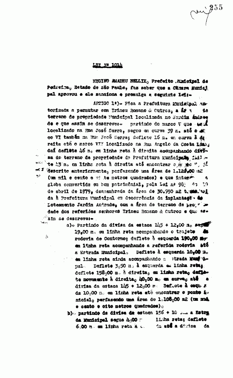 Outros, a área de terreno de propriedade municipal localizada no Jardim Andrade e que assim se descreve. - N° 1014 de 20/03/1980