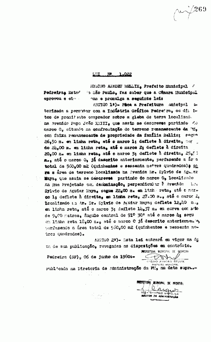 Ementa: Artigo 1º - Fica a Prefeitura Municipal autorizada a permutar com a Indústria Gráfica Pedreira, os direitos de prominente comprador sobre a gleba de terra localizada na Avenida Papa João XXIII, que assim se descreve.
