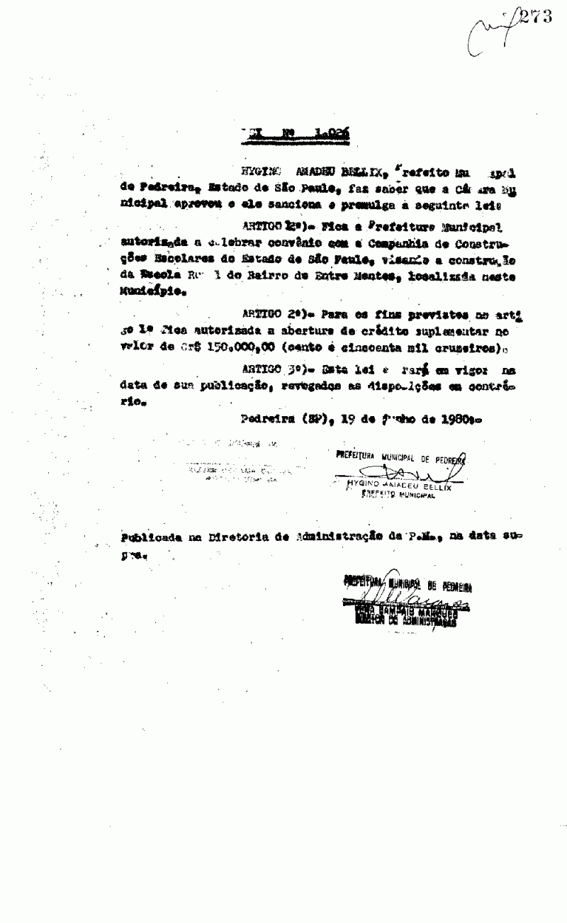 Ementa: Artigo 1º - Fica a Prefeitura Municipal autorizada a celebrar convênio com a Companhia de Construções Escolares do Estado de São Paulo, visando a construção da Escola Rural do Bairro de Entre Montes, localizada neste Município.