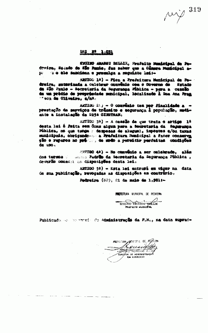 Ementa: Artigo 1º - Fica a Prefeitura Municipal de Pedreira, autorizada a celebrar convênio com o Governo do Estado de São Paulo - Secretaria da Segurança Pública - para a cessão de um prédio de propriedade municipal, localizado à Rua Ana Francisca de Oliveira, s/nº.