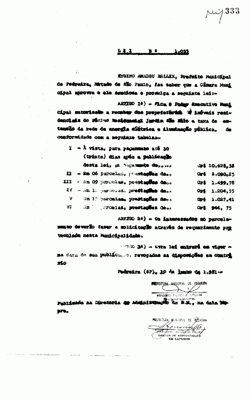 Ementa: Artigo 1º - Fica o Poder Executivo Municipal autorizado a receber dos proprietários os imóveis residenciais do Núcleo Residencial Jardim São Nilo a taxa de extensão da rede de energia elétrica e iluminação pública, de conformidade coma a seguinte tabela.