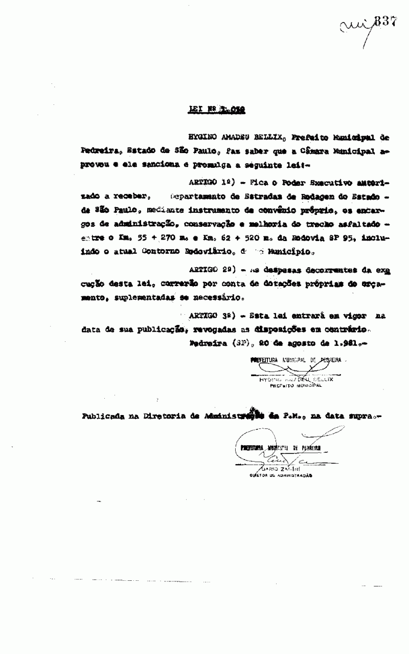 Ementa: Artigo 1º - Fica o Poder Executivo autorizada a receber do Departamento de Estradas de Rodagem do Estado de São Paulo, mediante instrumento de convênio próprio, os encargos de administração, conservação e melhoria do trecho asfaltado entre o km 55+270 m e km 62+520 m, da Rodovia SP 95, inclusive o atual Contorno Rodoviário, deste Município.
