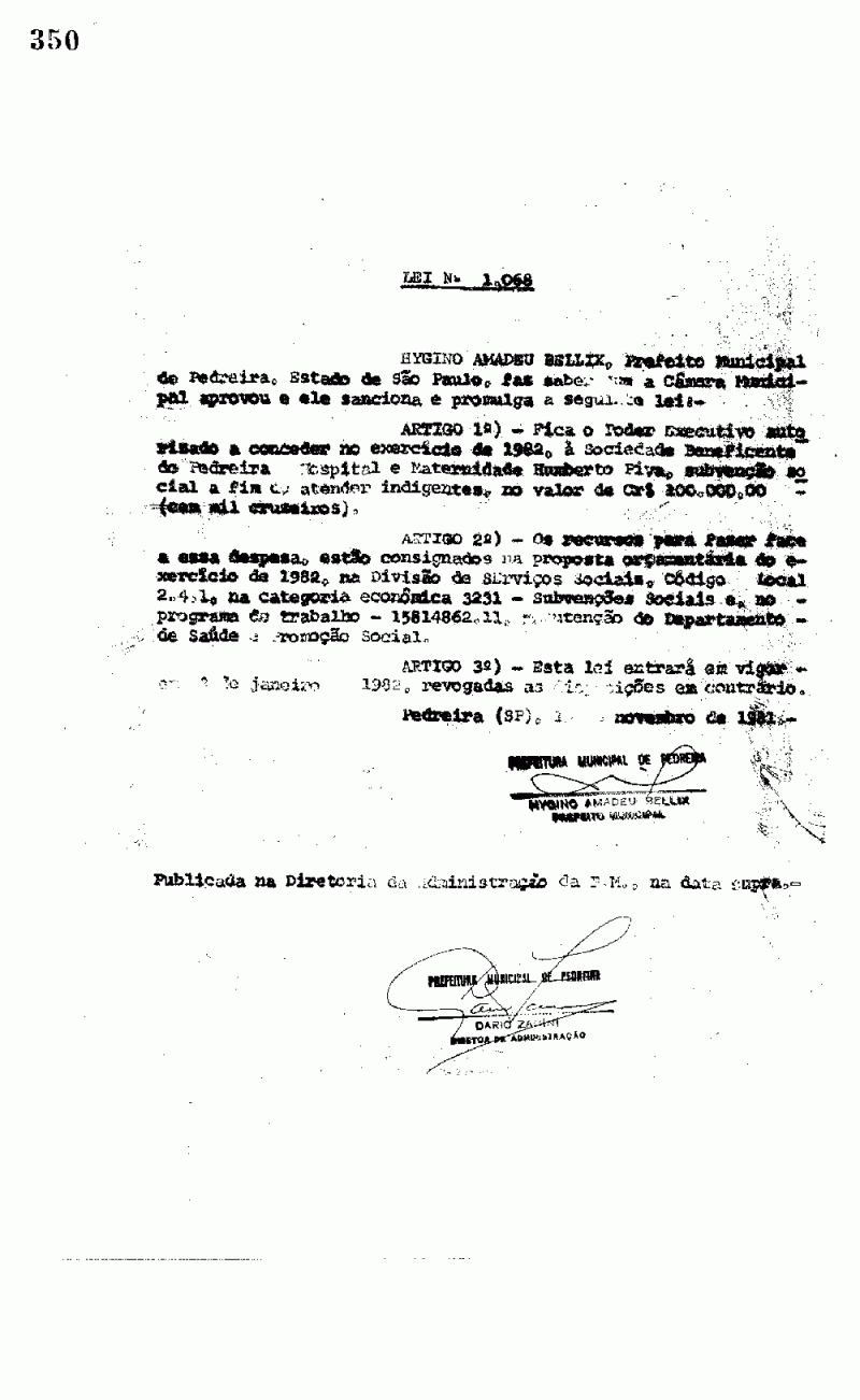 Ementa: Artigo 1º - Fica o Poder Executivo autorizado a conceder no exercício de 1982, à Sociedade Beneficente de Pedreira e Hospital e Maternidade Humberto Piva, subvenção social a fim de atender indigentes, no valor de Cr$ 100.000,00 (cem mil cruzeiros).