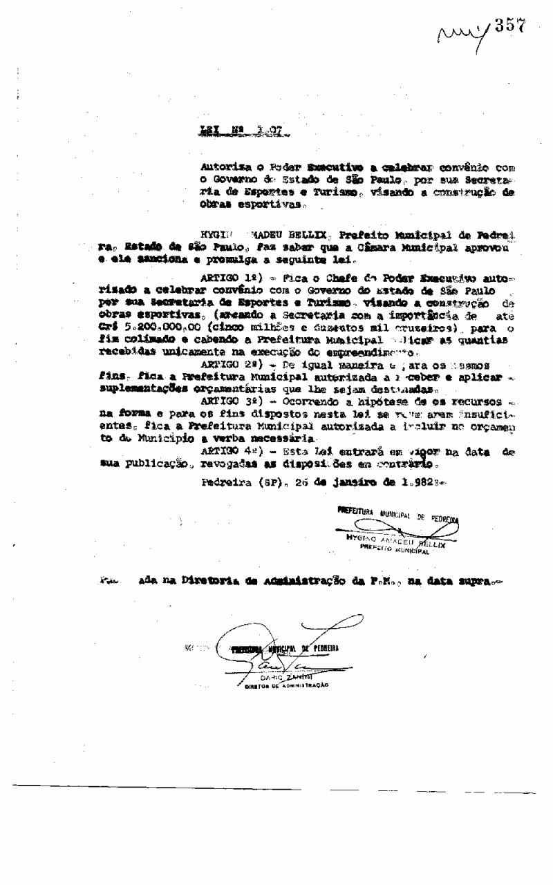 Ementa: Autoriza o Poder Executivo a celebrar convênio com o Governo do Estado de São Paulo, por sua Secretaria de Esportes e Turismo, visando a construção do obras esportivas.