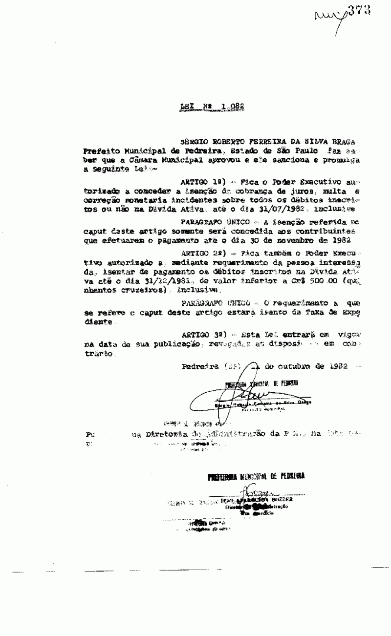 Ementa: Artigo 1º - Fica o Poder Executivo autorizado a conceder a isenção da cobrança de juros, multa e correção monetária incidentes sobre todos os débitos inscritos ou não em Dívida Ativa, até o dia 31/07/1982, inclusive.