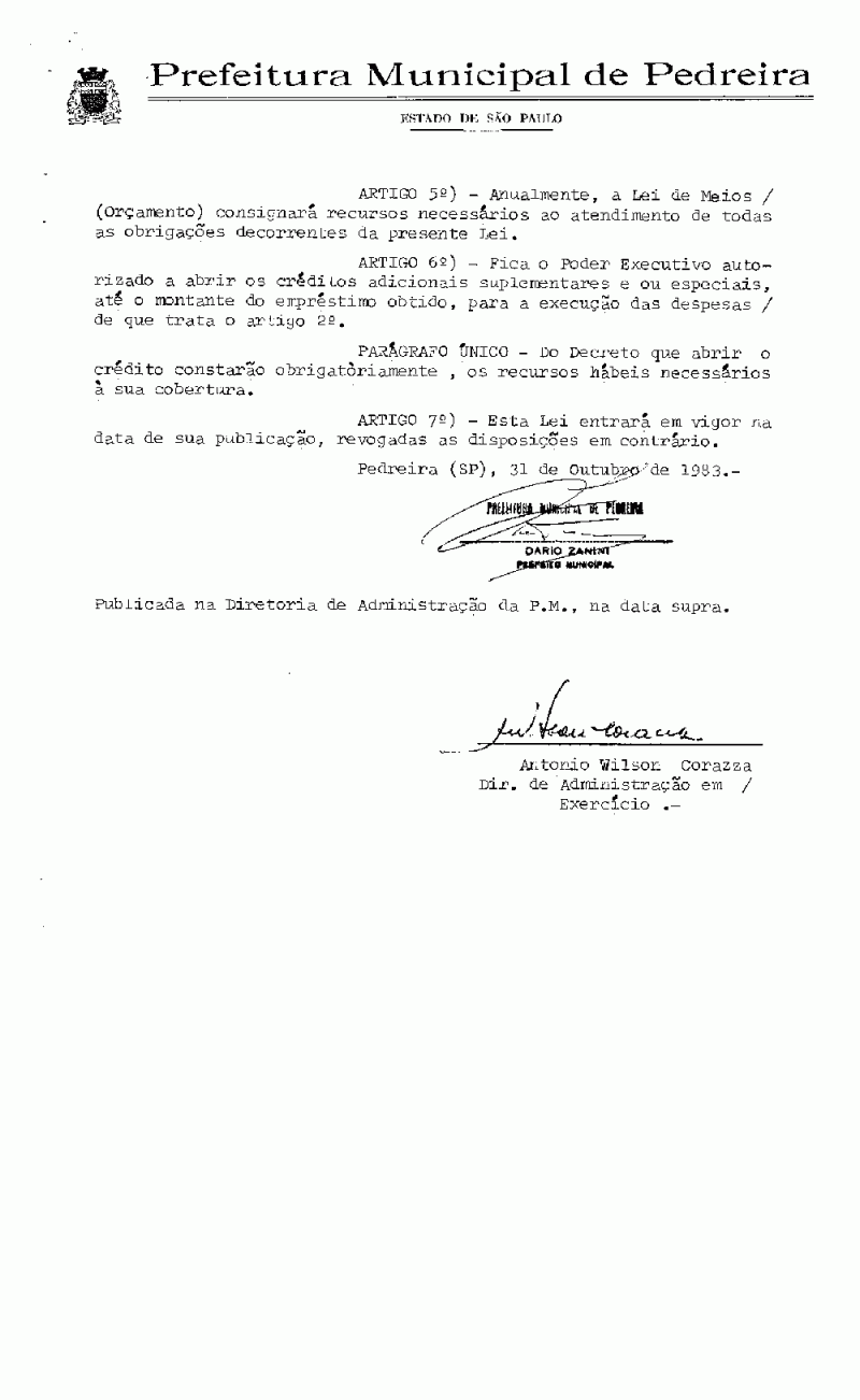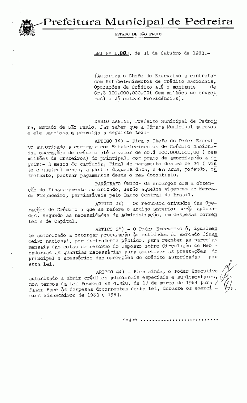 Ementa: Autoriza o Chefe do Executivo a contratar com estabelecimentos de crédito nacional, operações de crédito até o montante de Cr$ 100.000.000,00 (cem milhões de cruzeiros) e dá outras providências.