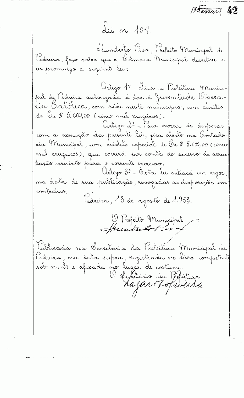 Ementa: Artigo 1º - Fica a Prefeitura Municipal de Pedreira autorizada a doar à Juventude Operária Católica, com sede neste Município, um auxílio de Cr$ 5.000,00 (cinco mil cruzeiros).