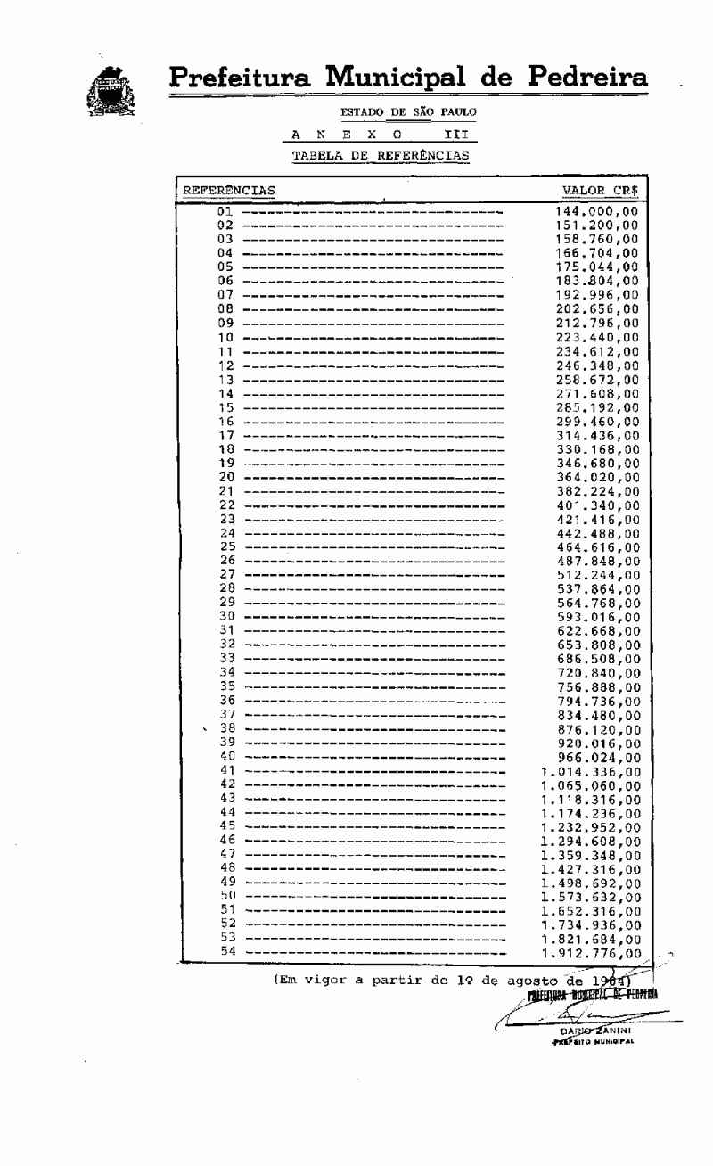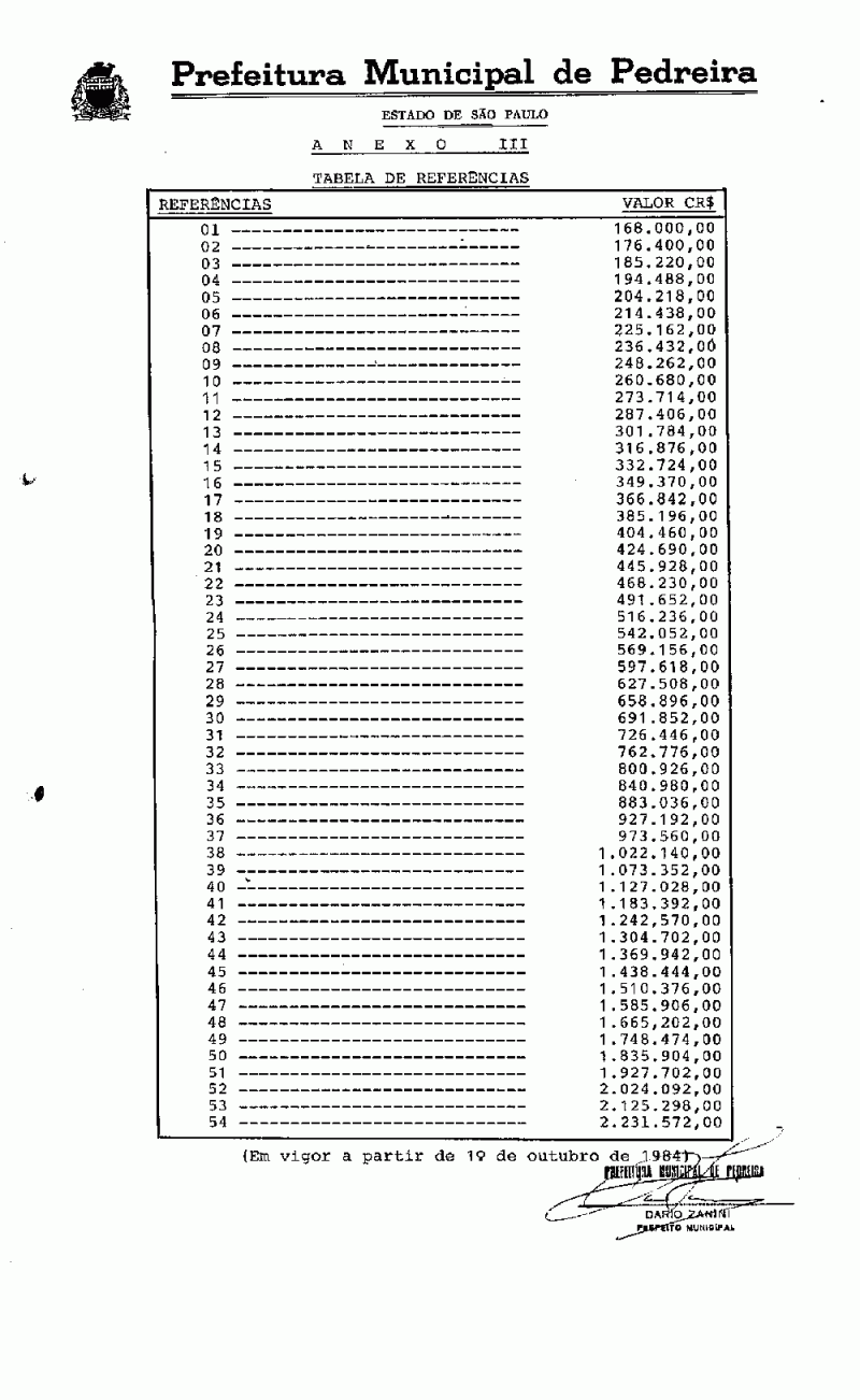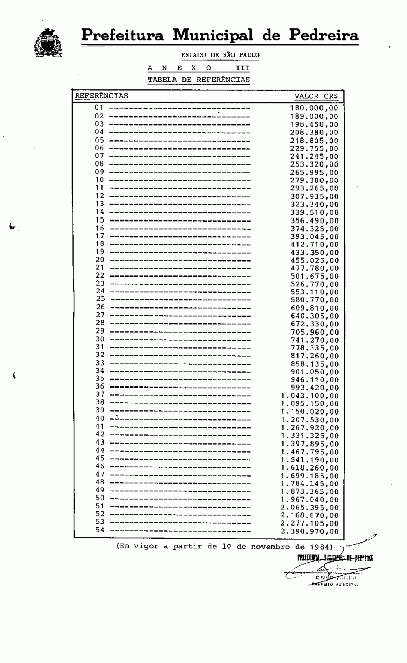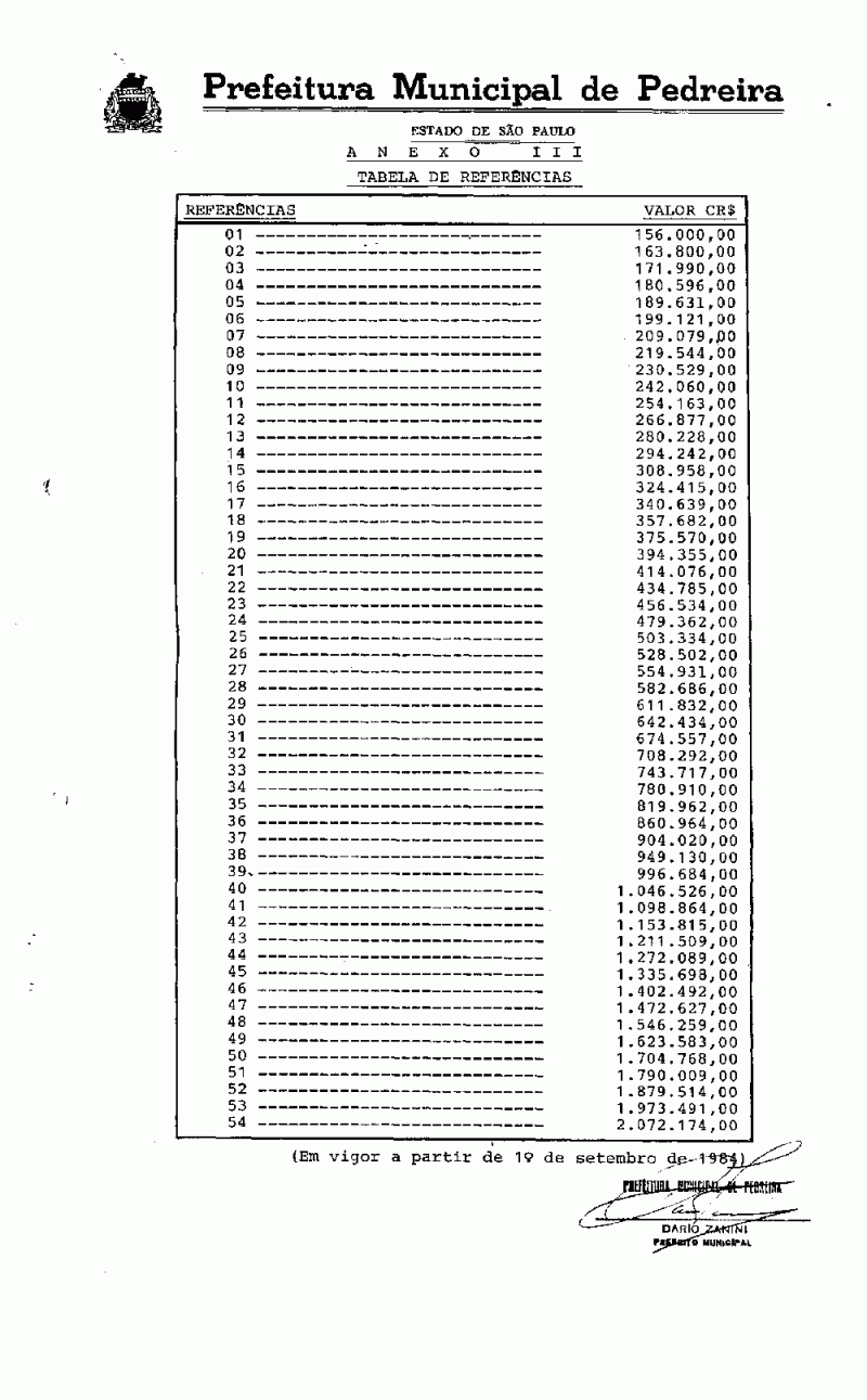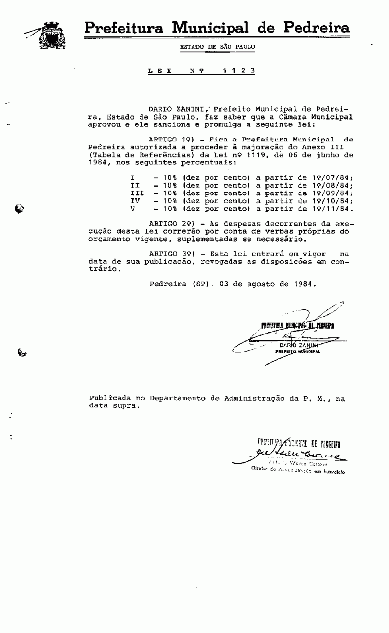 Ementa: Artigo 1º - Fica a Prefeitura Municipal de Pedreira autorizada a proceder à majoração do Anexo III (Tabela de Referências) da Lei nº 1119, de 06 de junho de 1984, nos seguintes percentuais.