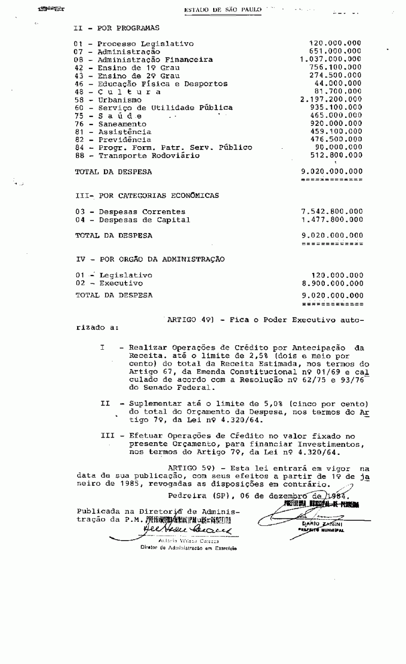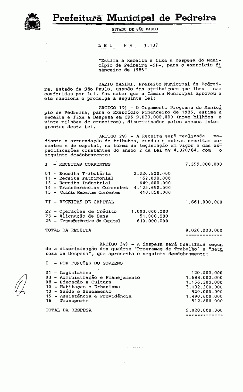 Ementa: Estima a Receita e fixa a Despesa do Município de Pedreira - SP, para o exercício financeiro de 1985.